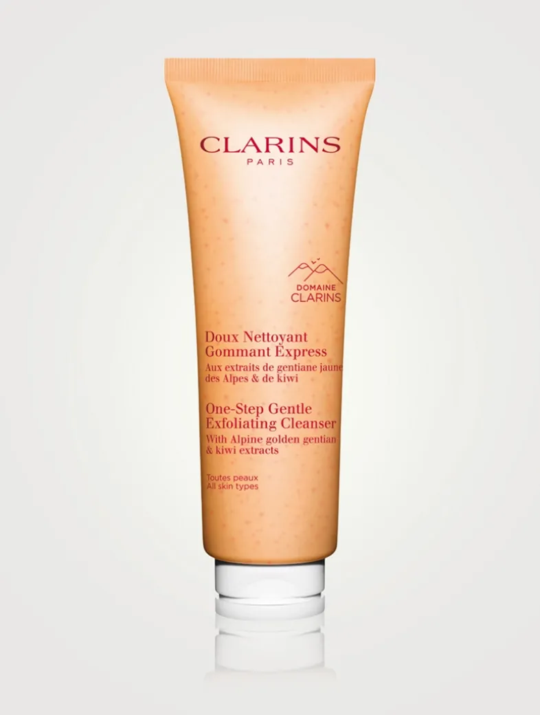 This 3-in-1 cleanser, rich in Alpine herb extracts from the Domaine Clarins, removes makeup, cleanses, and exfoliates all skin types in one simple step while maintaining a balanced complexion. Rich in organic soapwort and kiwi extracts, it leaves skin cleansed, fresh, and radiant. The Clarins [Gentle Complex] with organic yellow gentian and organic lemon balm extracts helps to soothe and soften the skin. This fresh gel, enriched with plant-based microbeads, transforms into a lightweight and creamy foam. A light ‘peeling’ effect gently leaves the skin soft and clear after rinsing.