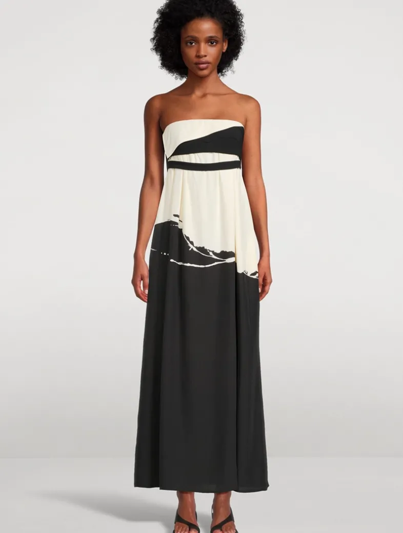 The Ophelia maxi dress is designed with an abstract motif and cut to a strapless silhouette. Features a bustier-style bra with integral boning and padding, along with snap fastenings at the back. Finished with hidden slip pockets.