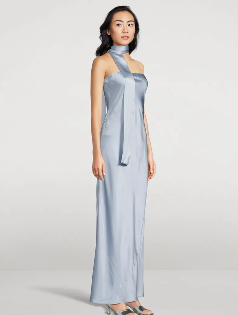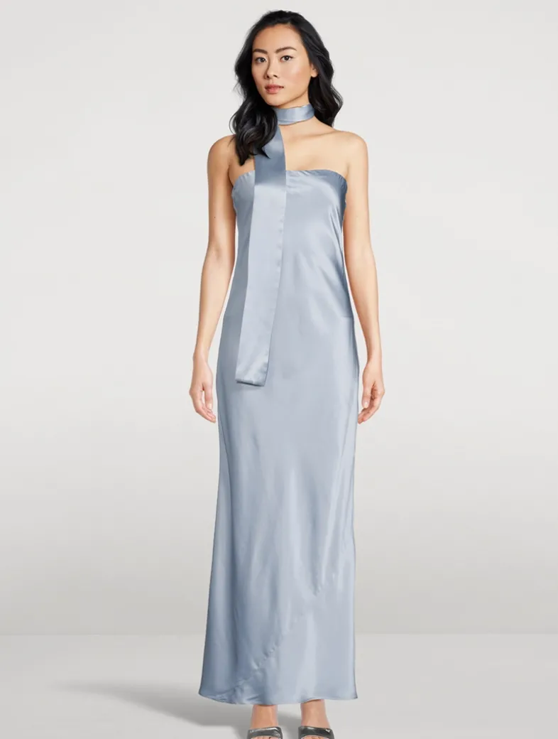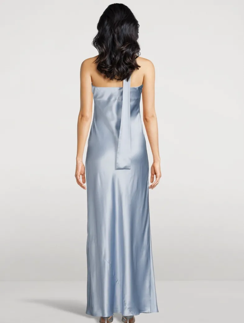 Crafted from a luscious silk charmeuse, this strapless gown exudes a refined opulence. It has elastic neckline and a floor-grazing hem. The dress can be styled with the separate neck scarf.