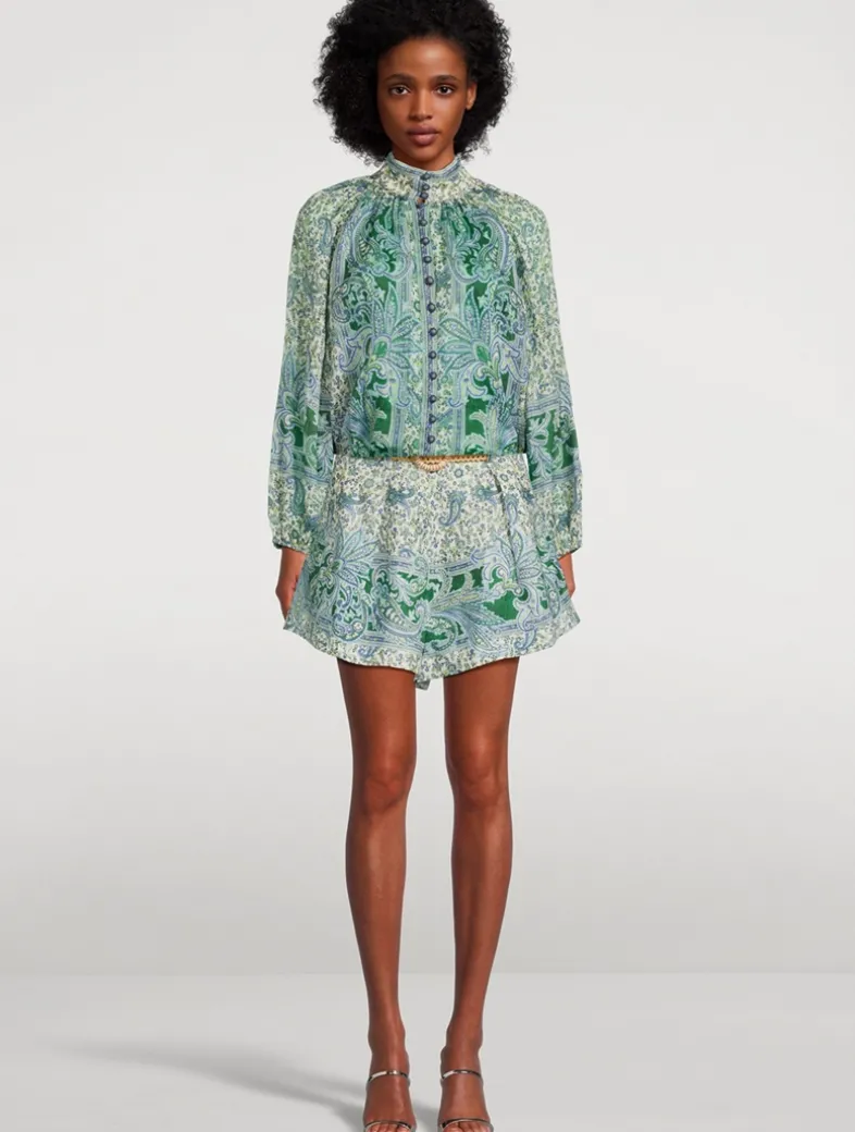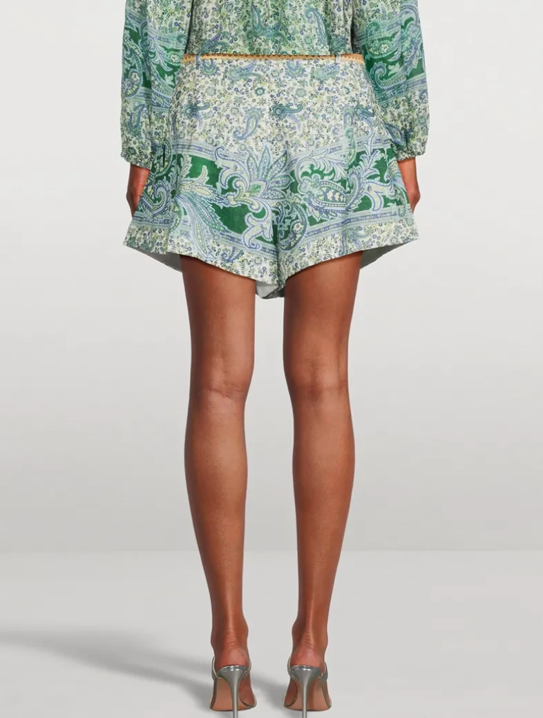 These high-rise linen shorts in an allover paisley print feature side seam pockets and a removable raffia buckle belt to define your waist. Finished with an invisible zip at the back, they have tucks throughout to enhance their fluttering shape.