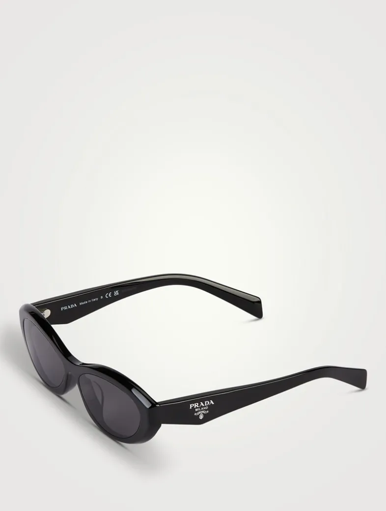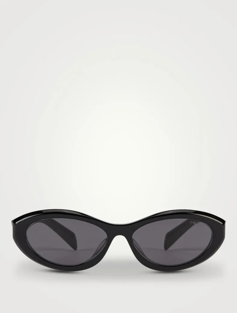 These oval-meets-cat-eye sunglasses are made from acetate with slightly beveled rims. The sleek, angular temples are accentuated with contrast Prada logo lettering.
