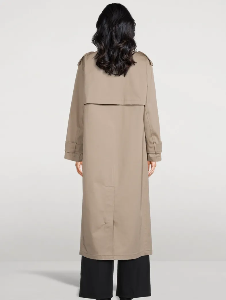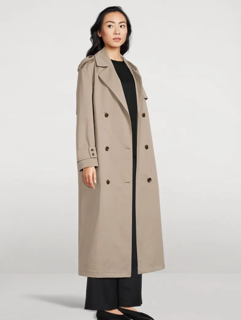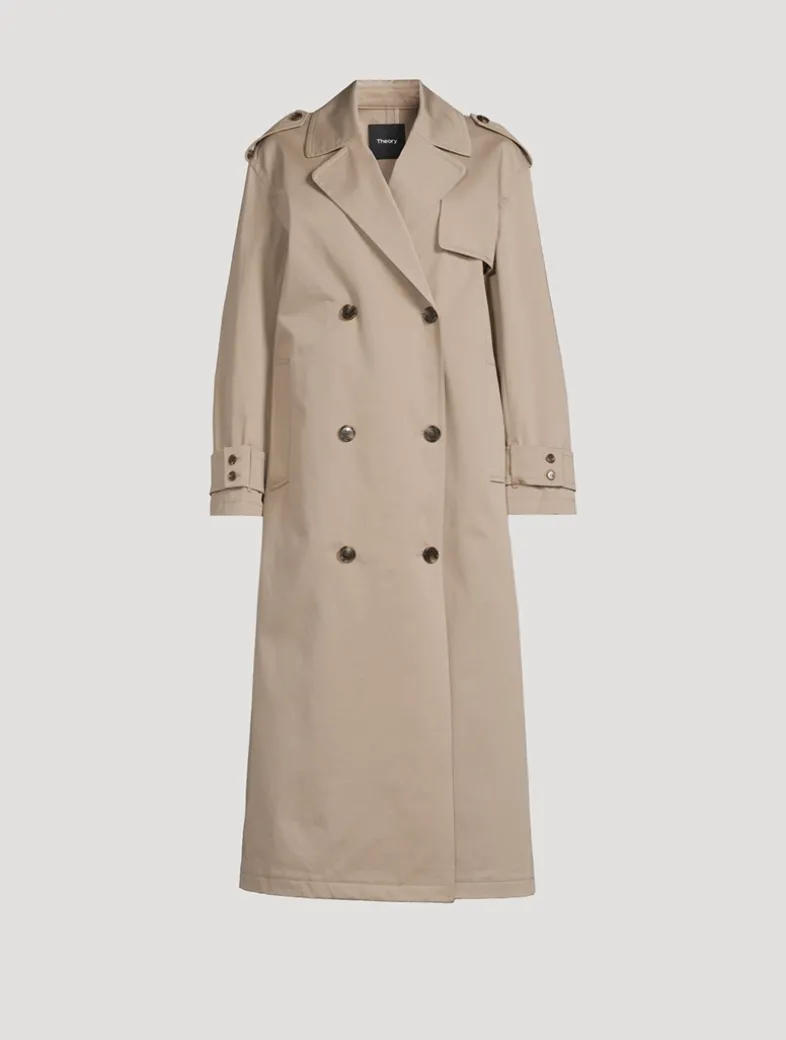 The oversized cut of this classic trench coat is designed with a double-breasted front, buttoned epaulets, and notched lapels. It’s detailed with buttoned cuffs and hip welt pockets for a refined finish. Produced by a leading supplier in Turkey, this fabric was specially developed to offer elevated polish, while ensuring functionality through the construction, stretch, weight, and water-resistant finish.
