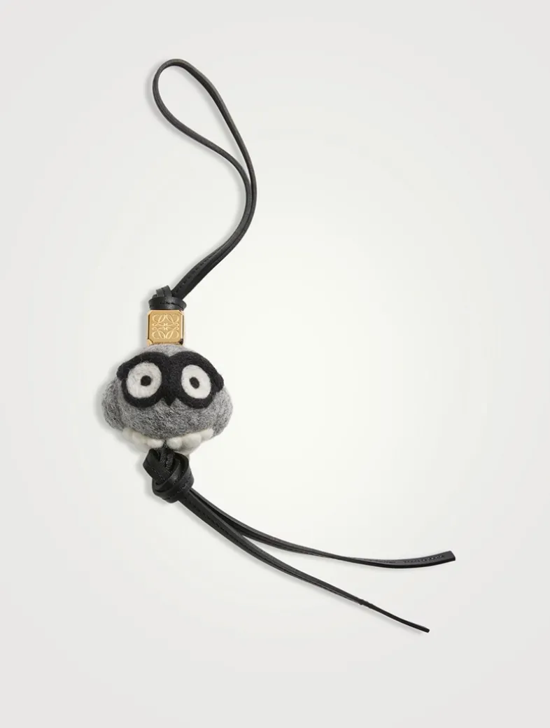 Owl charm in plush felt with a looped calfskin strap and an Anagram dice in a gold-tone finish.