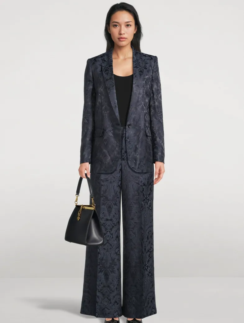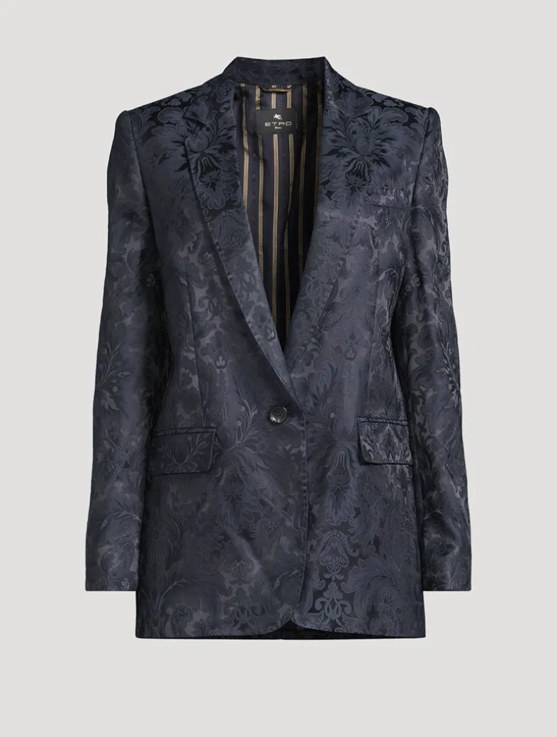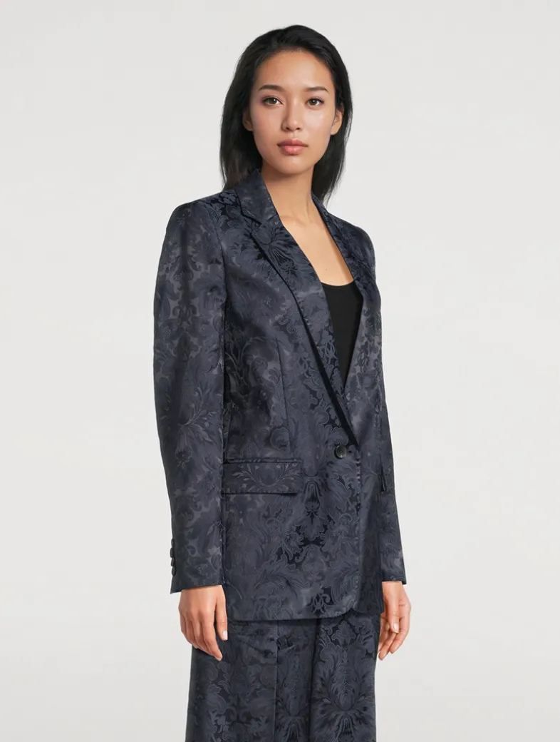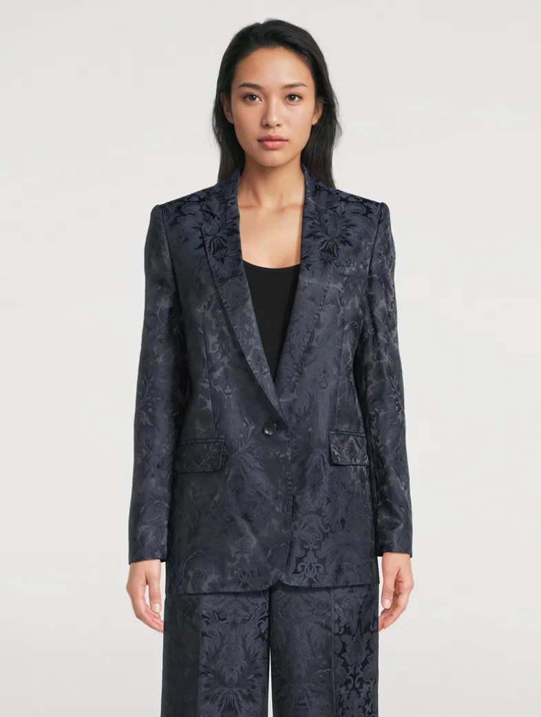 This single-breasted jacket with refined jacquard lace motif adds an elegant touch to your wardrobe.