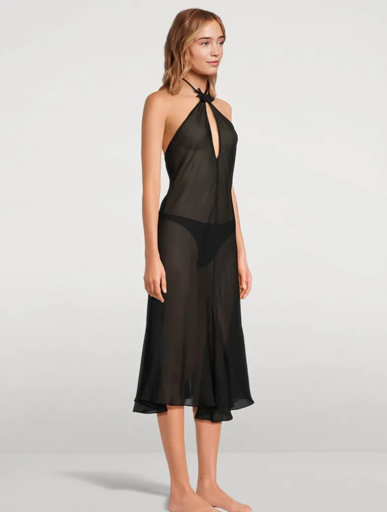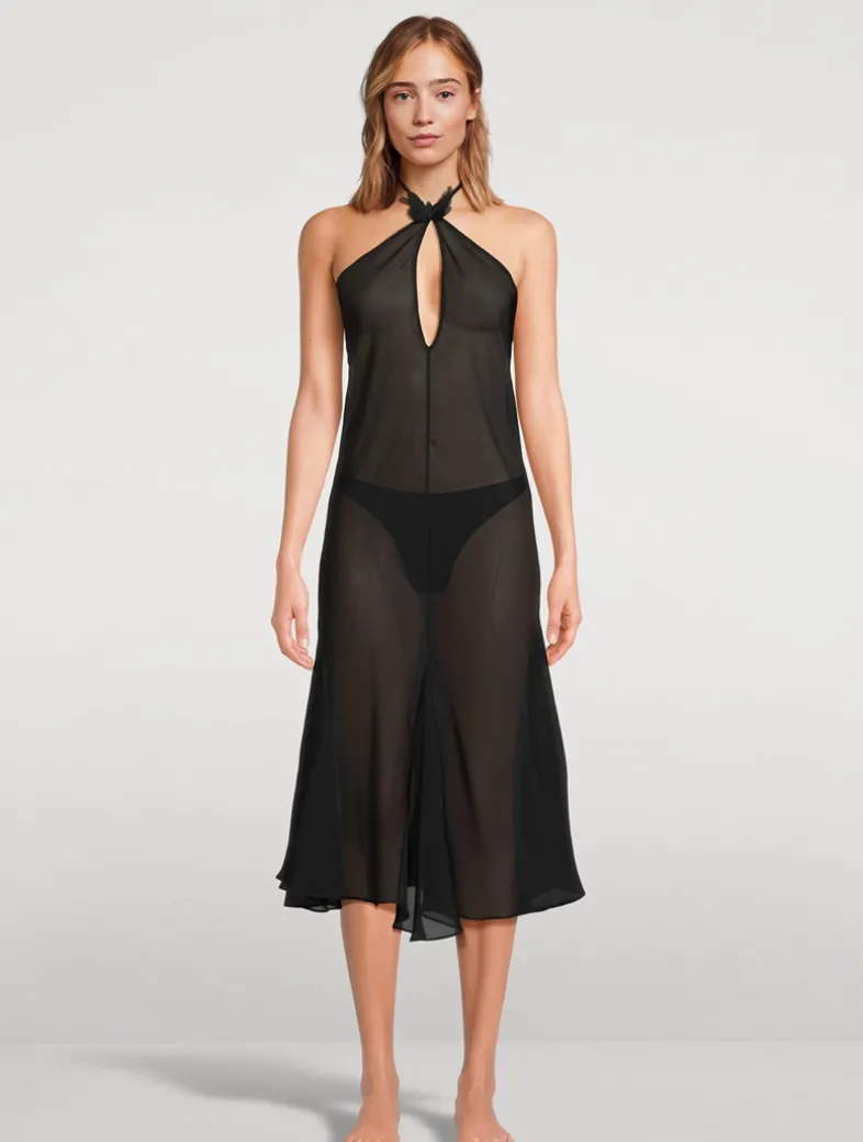 This semi-sheer dress features a keyhole design and offers a sculpting fit, complemented by a delicate butterfly detail that highlights your décolletage. The flouncy movement of the dress adds a touch of whimsy to every step.