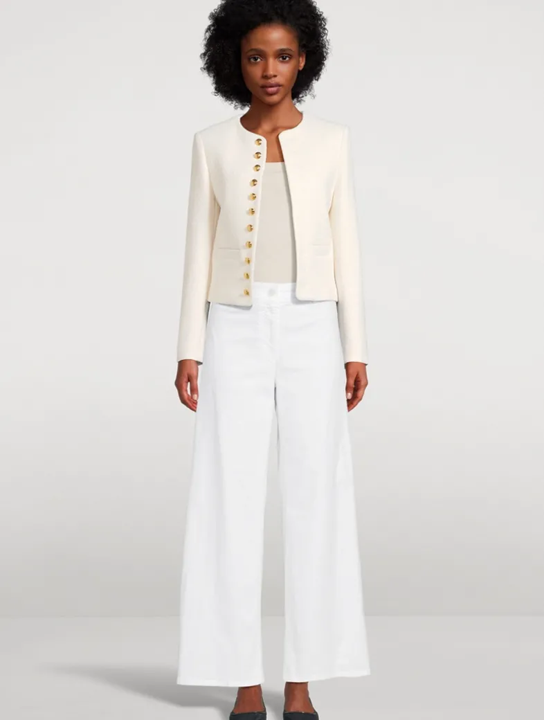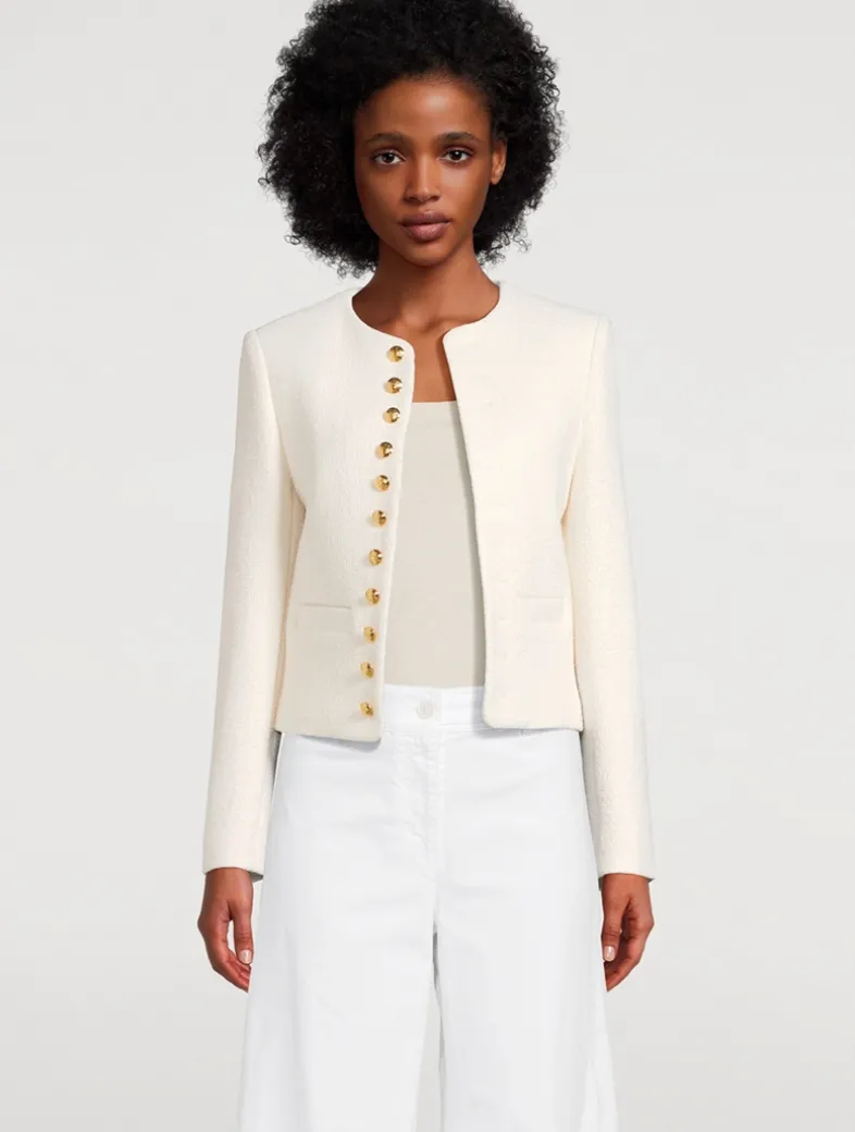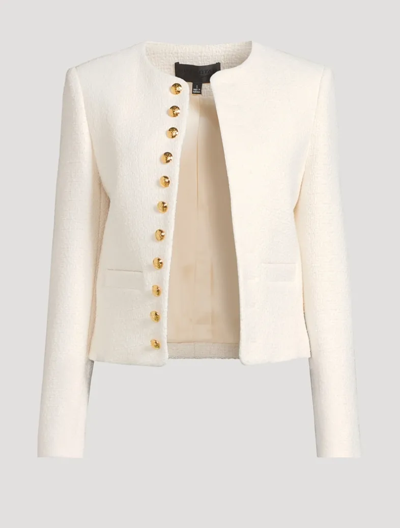 Crafted in tweed bouclé, this jacket is embellished with decorative crest buttons in antique brass at the placket and cuffs. It has soft padded shoulders and a boxy cut. Features non-functional buttonholes.