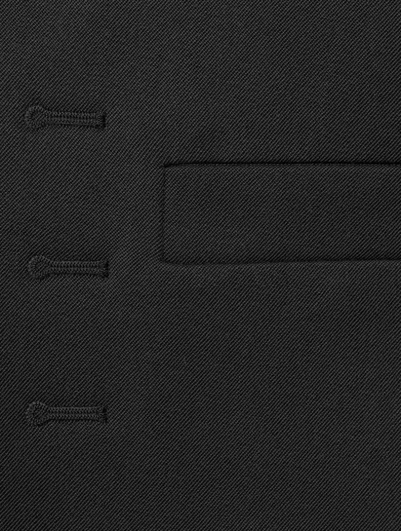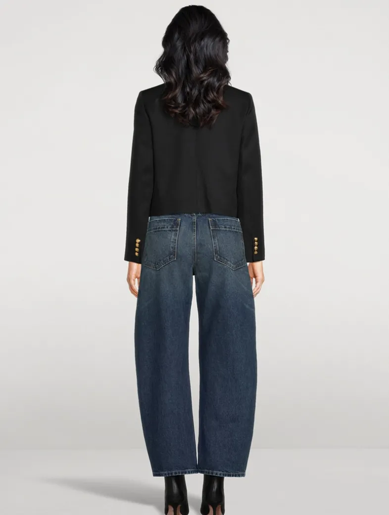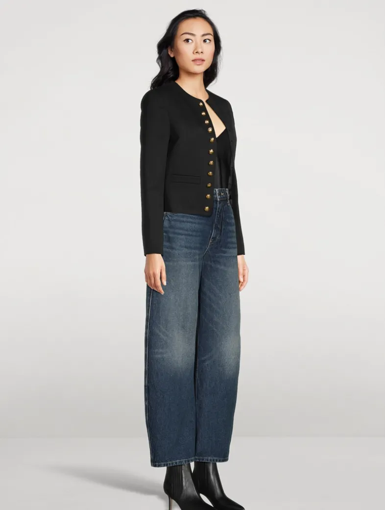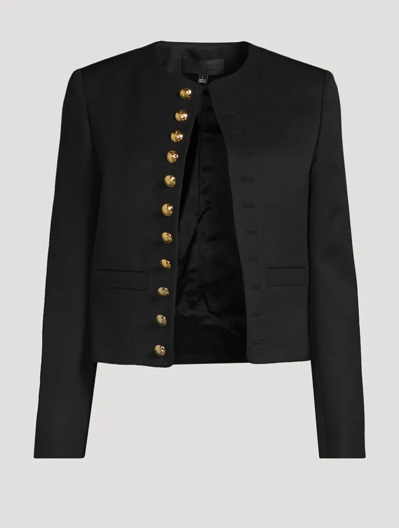 Crafted in an Italian wool gabardine, this jacket is embellished with decorative crest buttons in antique brass at the placket and cuffs. It has soft padded shoulders and a boxy cut. Features non-functional buttonholes.