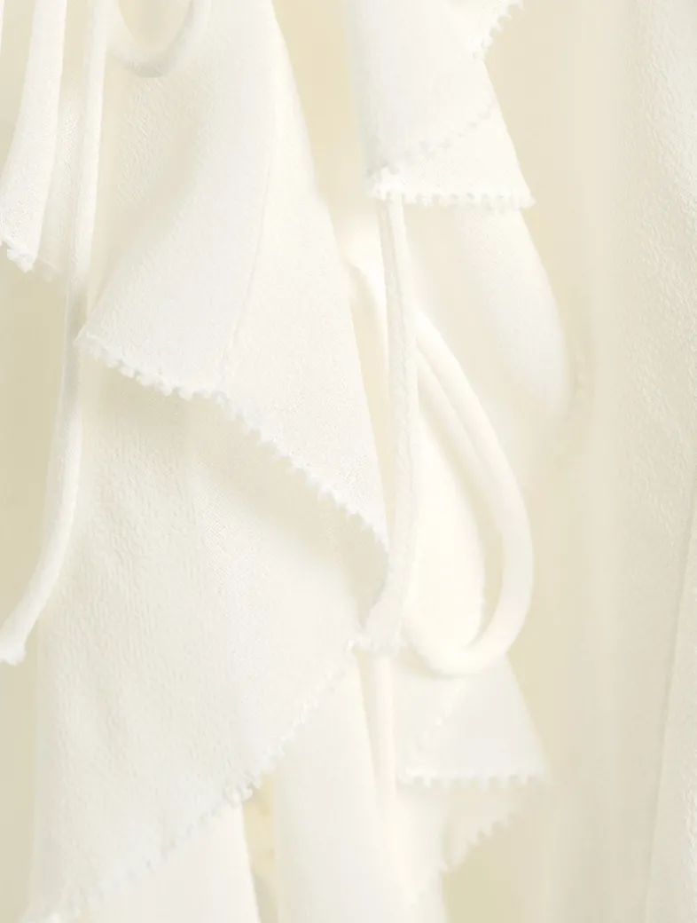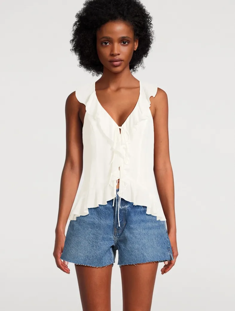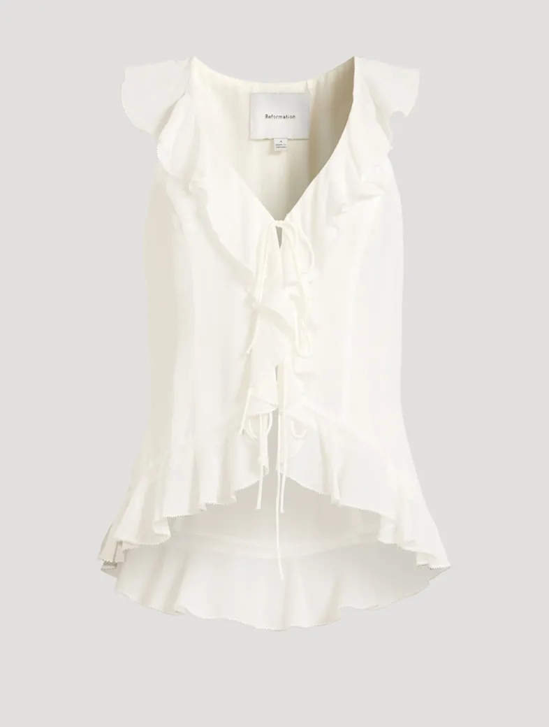 Framed by fluttering ruffles, this sleeveless blouse exudes a romantic elegance thanks to its tie-front closure and seamed design.