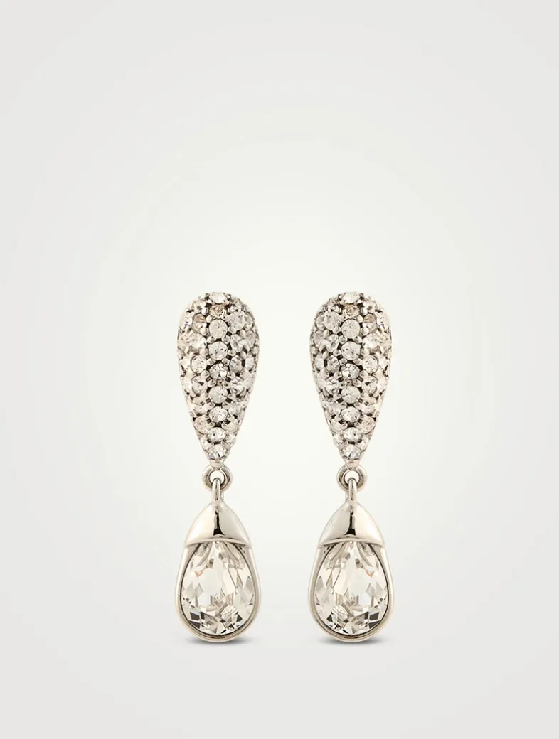 A large stone hangs from delicate teardrop shapes, each set with matching pavé crystals, combining bold design with detailed craftsmanship.