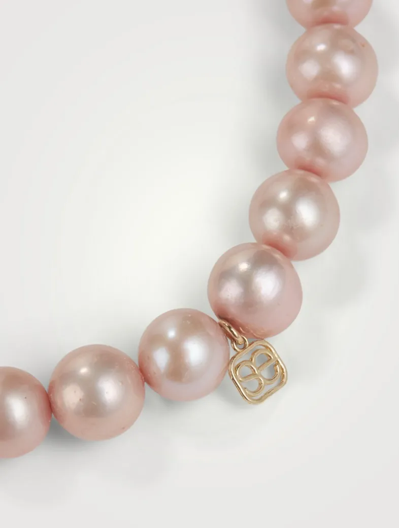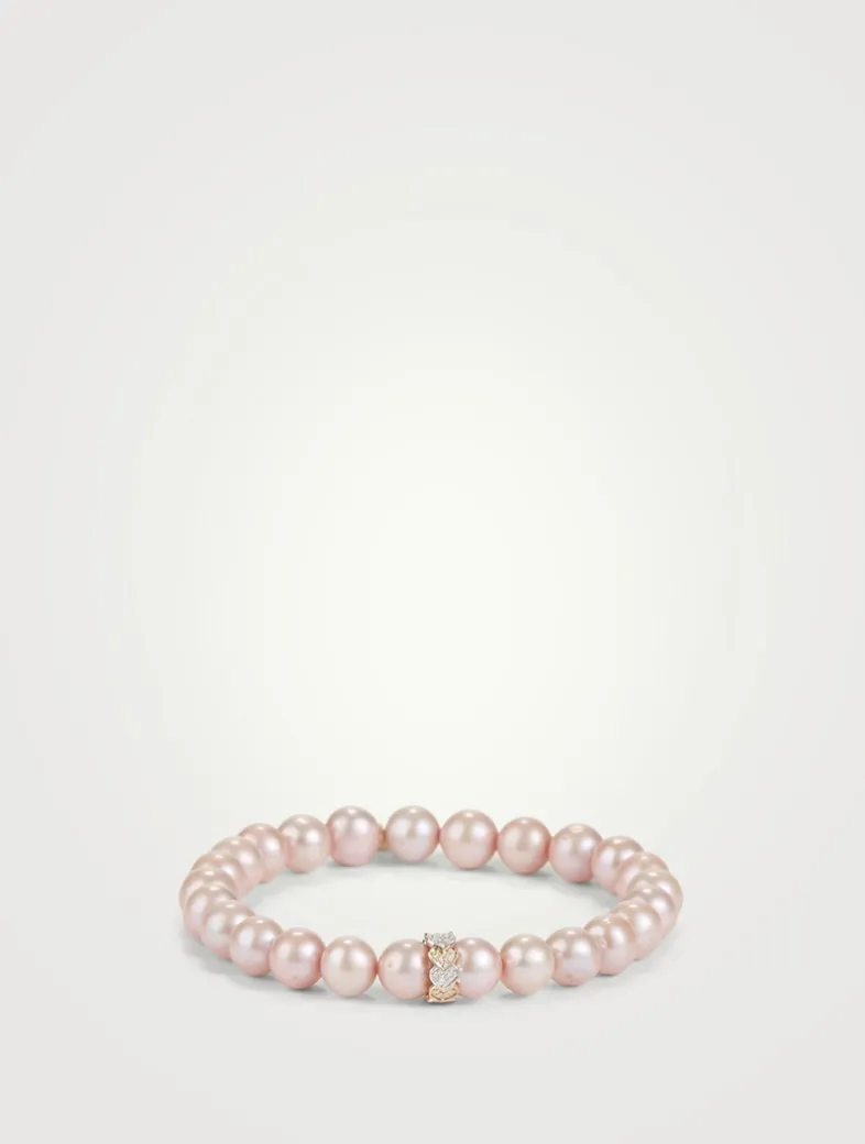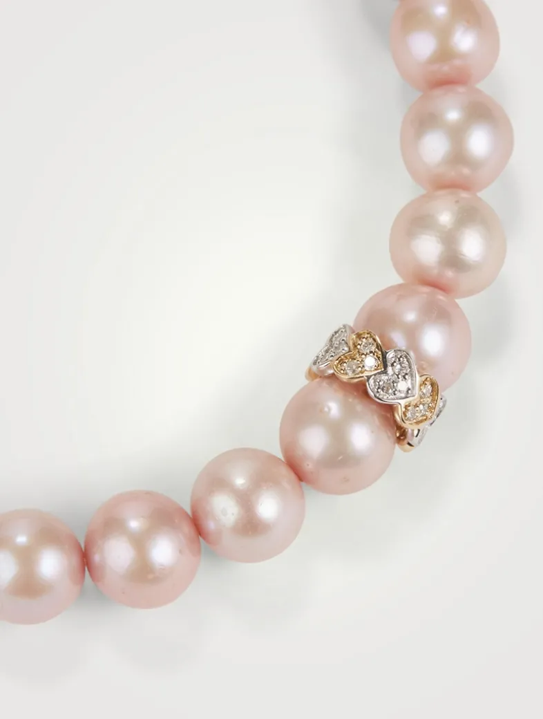 Strung with round pearls, this stretch bracelet features a 14k gold and diamond eternity heart rondelle. All SYDNEY EVAN beaded bracelets are strung on a stretch cord along with their 14k gold SE logo charm.