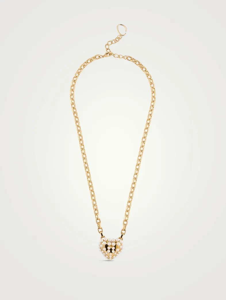 This necklace exudes romance with its lustrous, all-over faux pearl accented heart pendant set against a golden backdrop.
