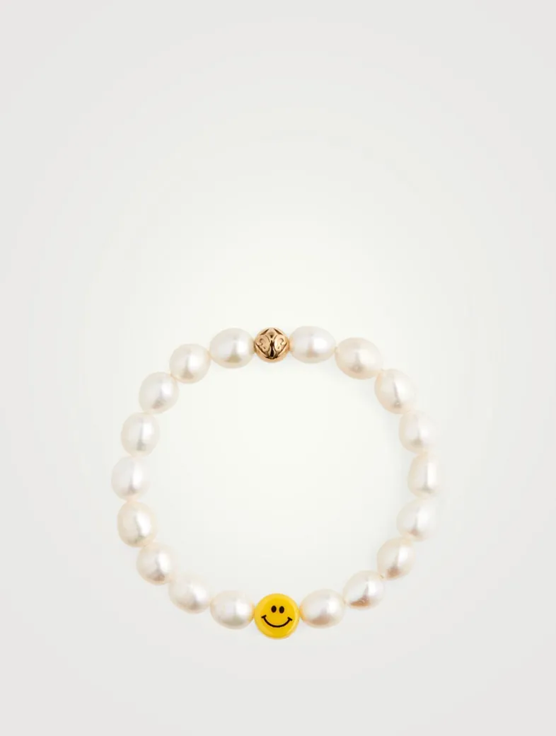 Designed and strung by hand at NIALAYA’s Los Angeles studio with beautiful baroque pearls and a playful, yellow smiley, this easy-on piece is crafted with a durable elastic cord, covered in strong silicone to permanently keep its soft elasticity.