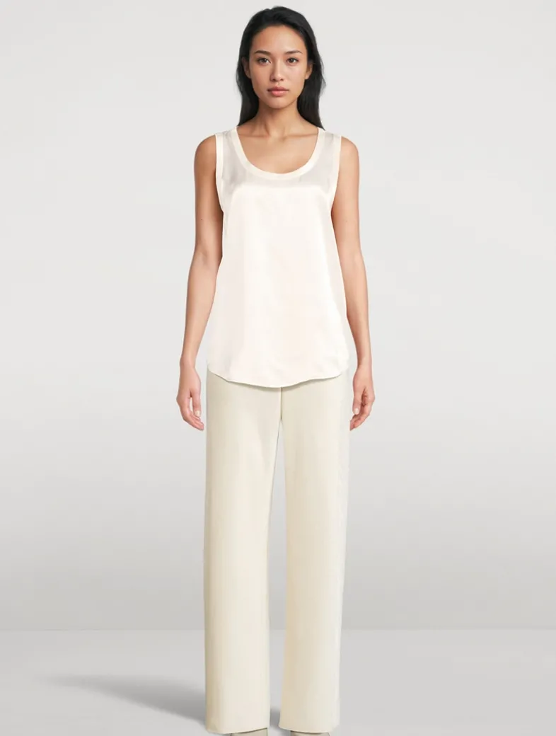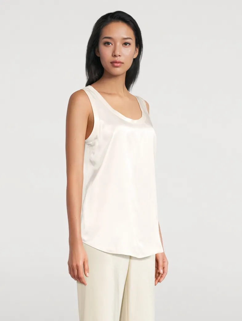 An L148 elevated essential, this sleeveless blouse is crafted from lustrous silk charmeuse that reverses to a smooth matte finish. The minimalist design is defined by a rounded neckline and softened shirttail hem.