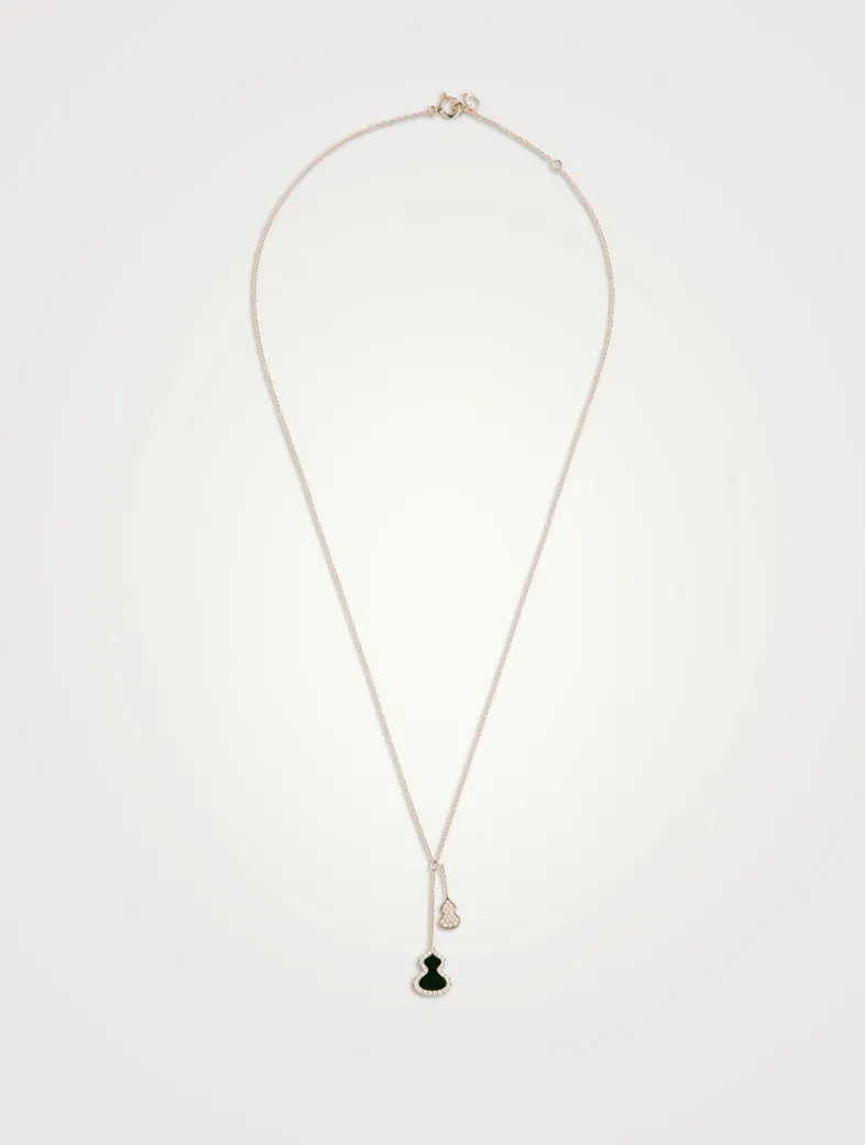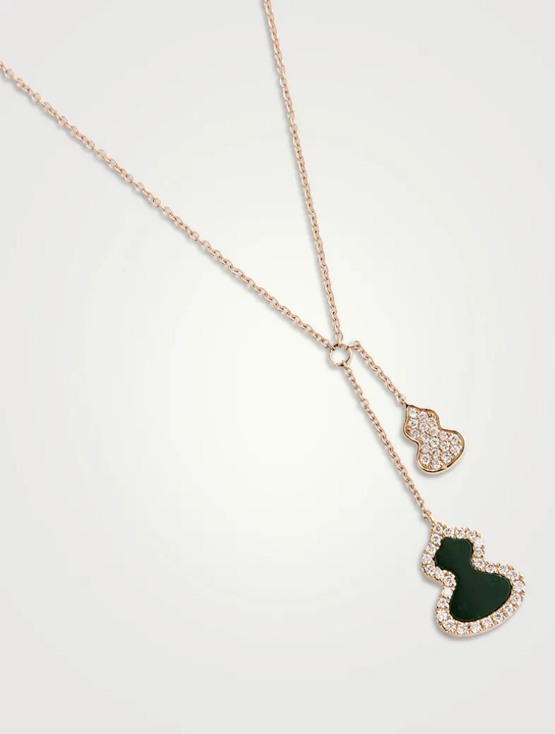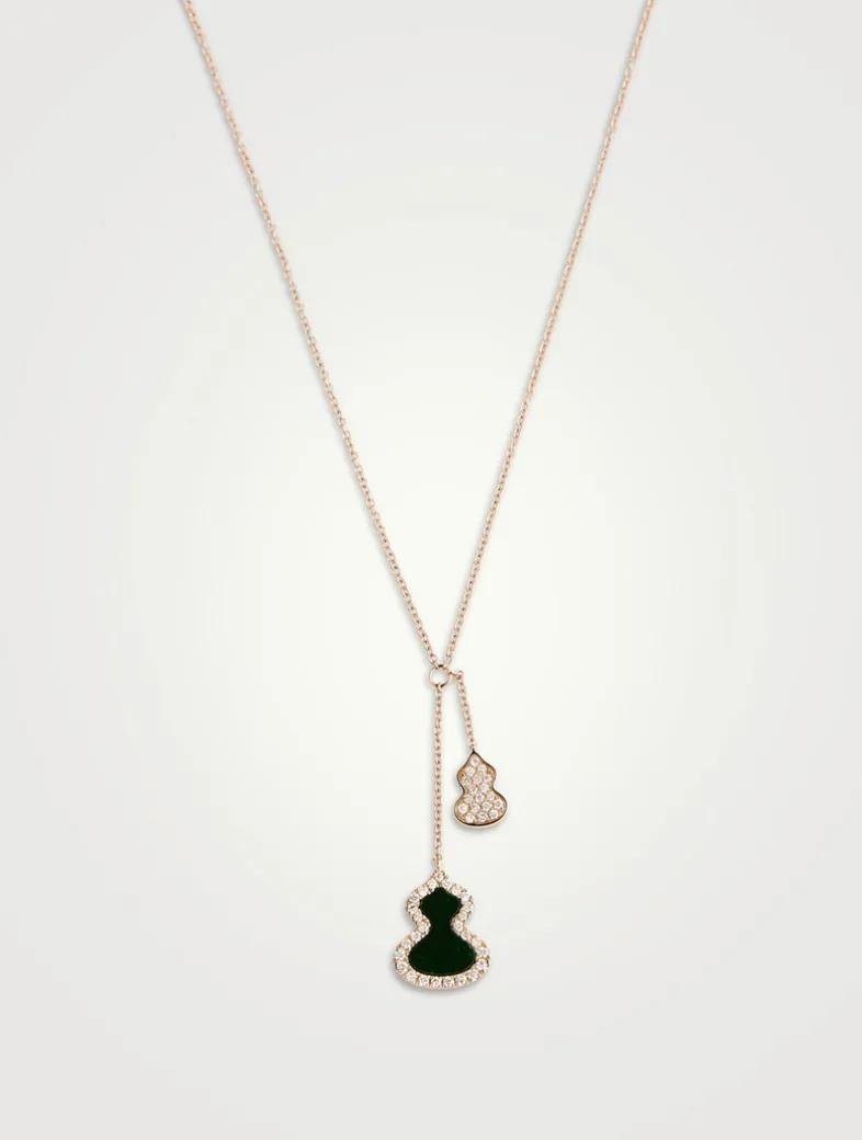Echoing the curves of the lucky number 8, Wulu is the most powerful symbol of good fortune and positive energy in China. Suspended from chains, this necklace features one diamond-filled Wulu pendant and one jade Wulu pendant framed with diamonds.