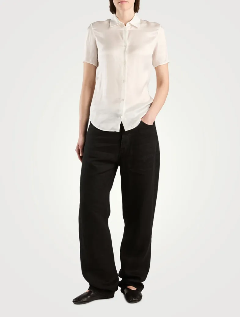 Made from a fluid satin fabric, this short-sleeve shirt is designed with a classic pointed collar, and curved shirttail hem. Finished in a relaxed-fit silhouette.