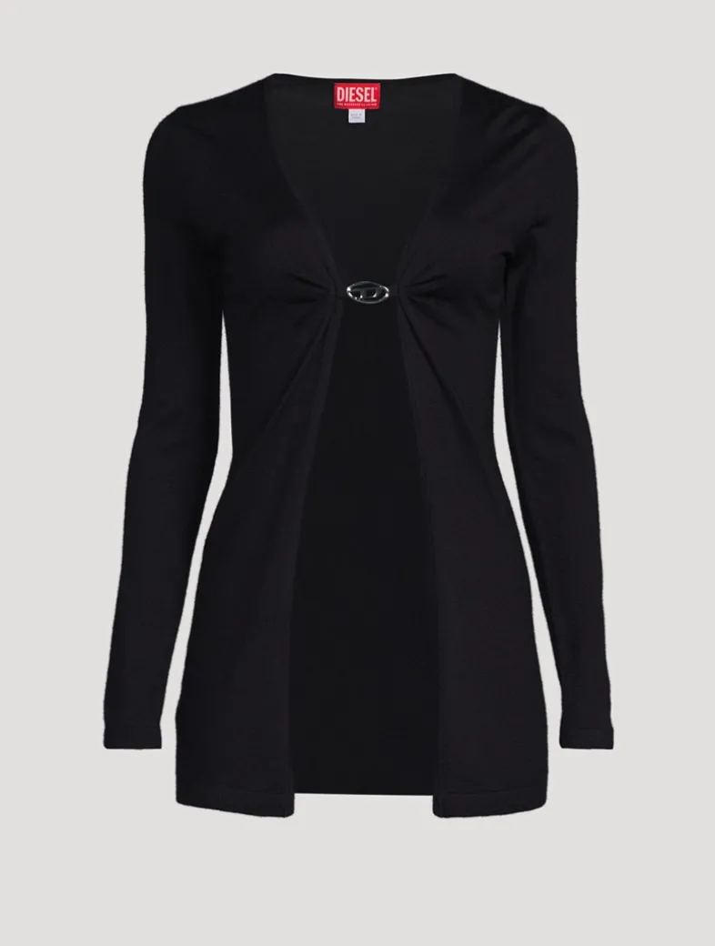 In lightweight and gauzy wool, this Diesel open-front cardigan features a deep neckline fastened with a decorative metal logo plaque. The longer length falls to the low hip.