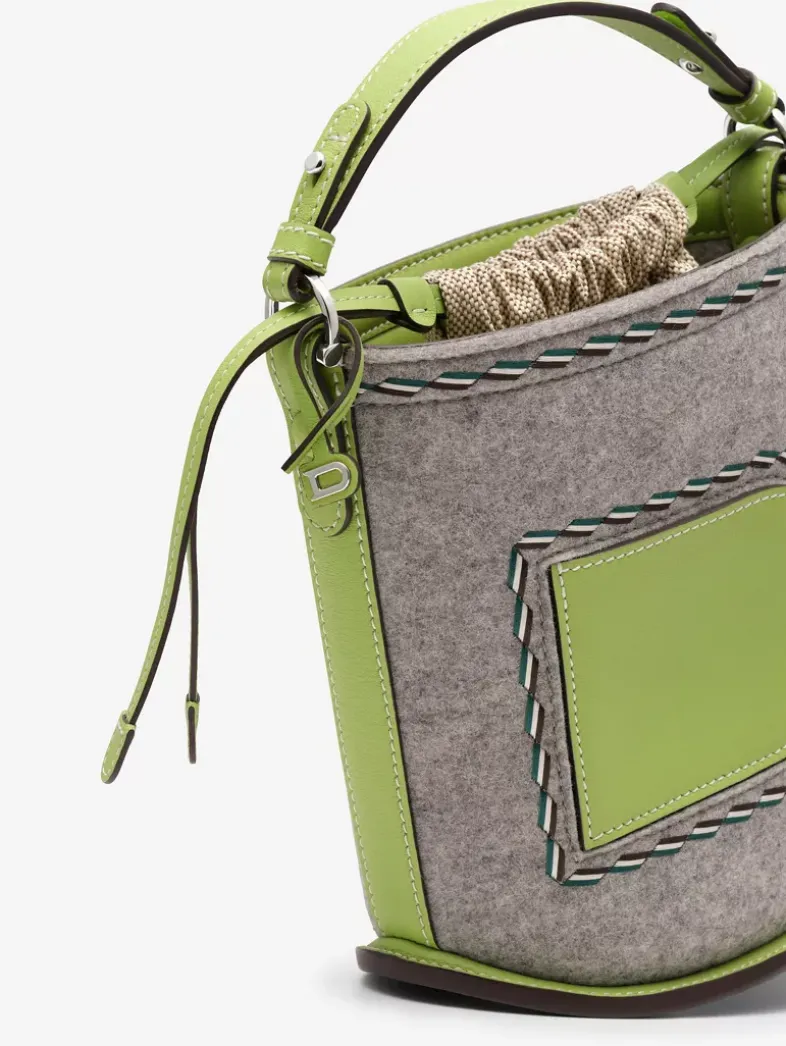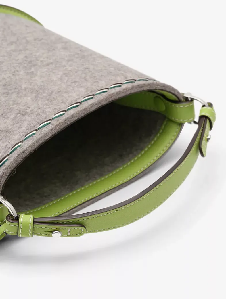 Classic bucket bag in natural felt and Supple Calf leather with elegant silver metal hardware. Features the Pin family’s signature D-shaped exterior pocket and convenient snap closure. Crafted in the colours Aloe and Heather Grey.