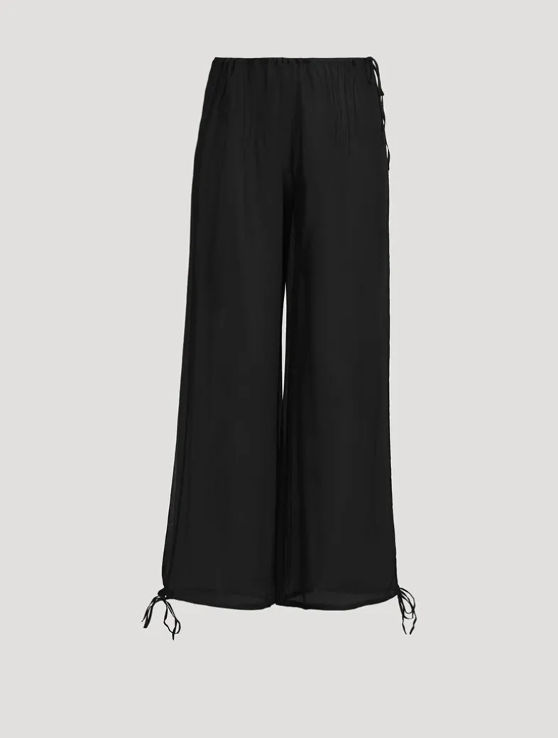 These Italian cotton-silk pants feature precisely placed pintucks at the front and back, creating a streamlined yet effortless shape. Adjustable ties at the waist and ankles add a customizable touch, allowing you to define the fit. Lightweight, refined, and made to move with you.
