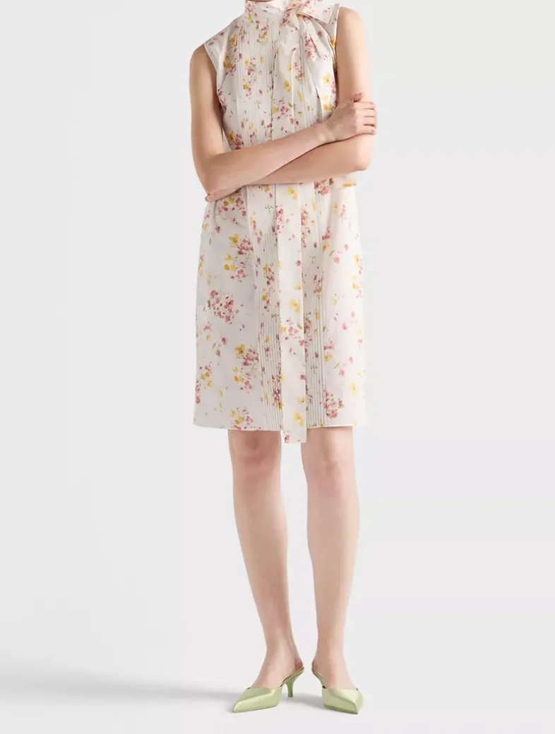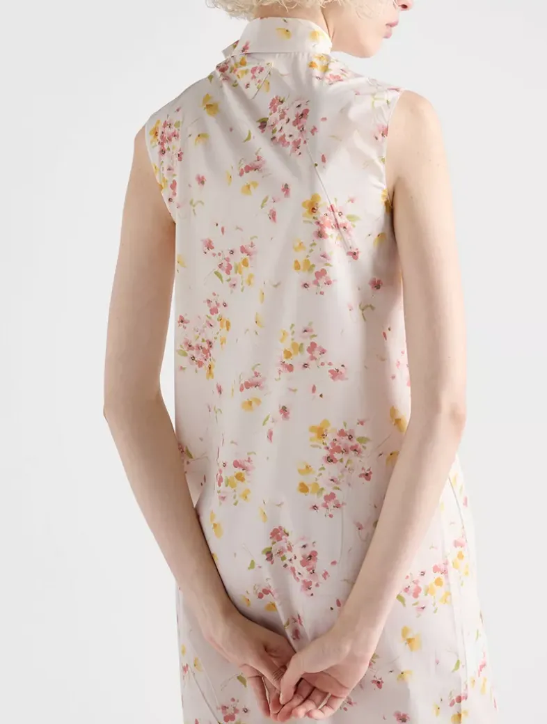 «Bouquet» print Straight fit Unlined Collar with tie Side zipper closure Sleeveless Inseam pockets Fabric triangle logo Straight hem Fabric tie belt