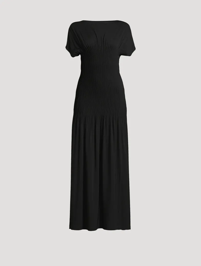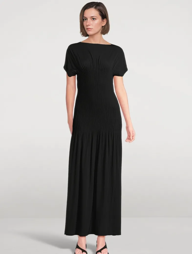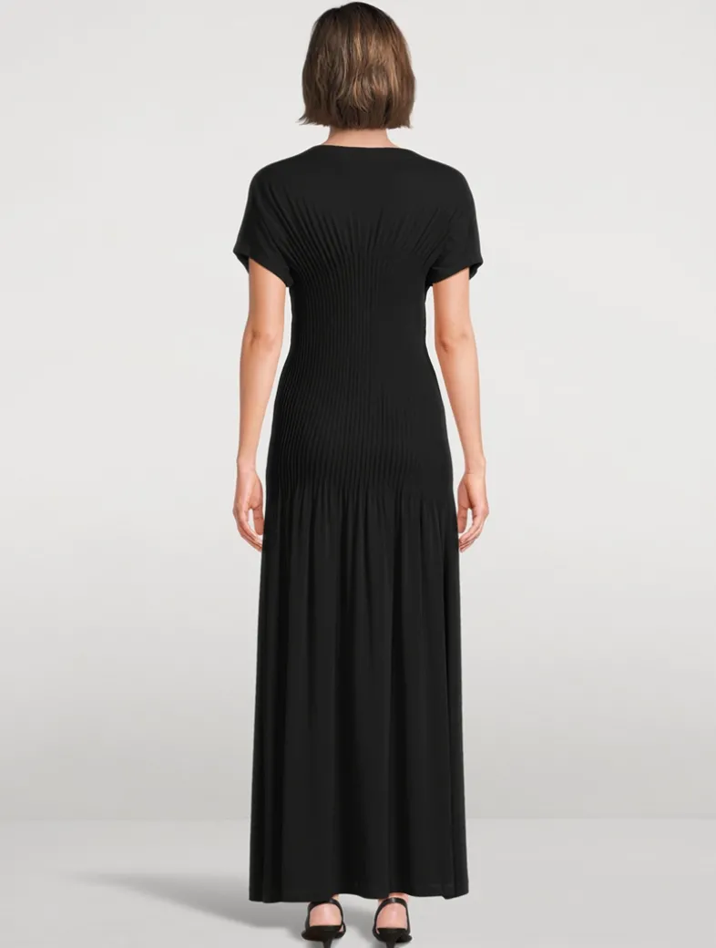 This TOTEME maxi dress is detailed with delicate knife pleats that expand into its short sleeves and long skirt. It is made from mid-weight jersey with a dry hand feel and cut to a waist-hugging silhouette.