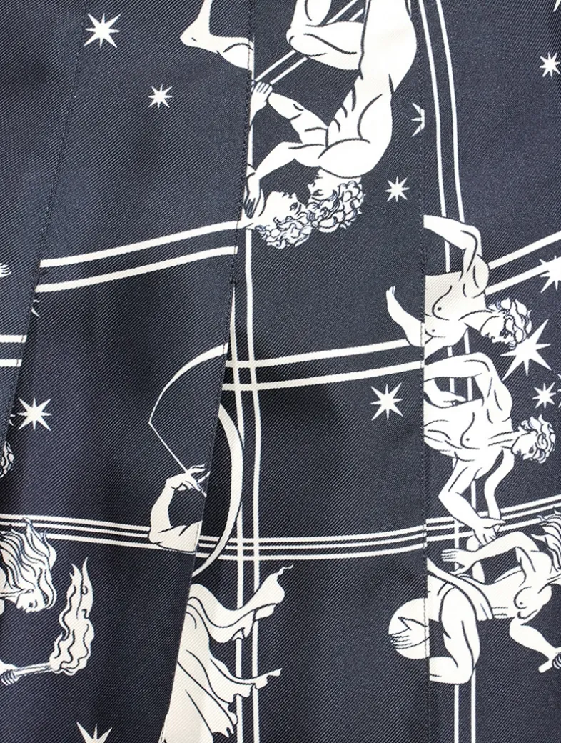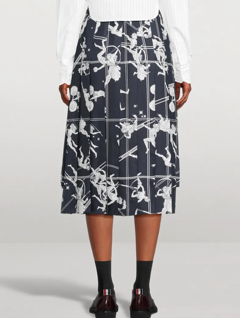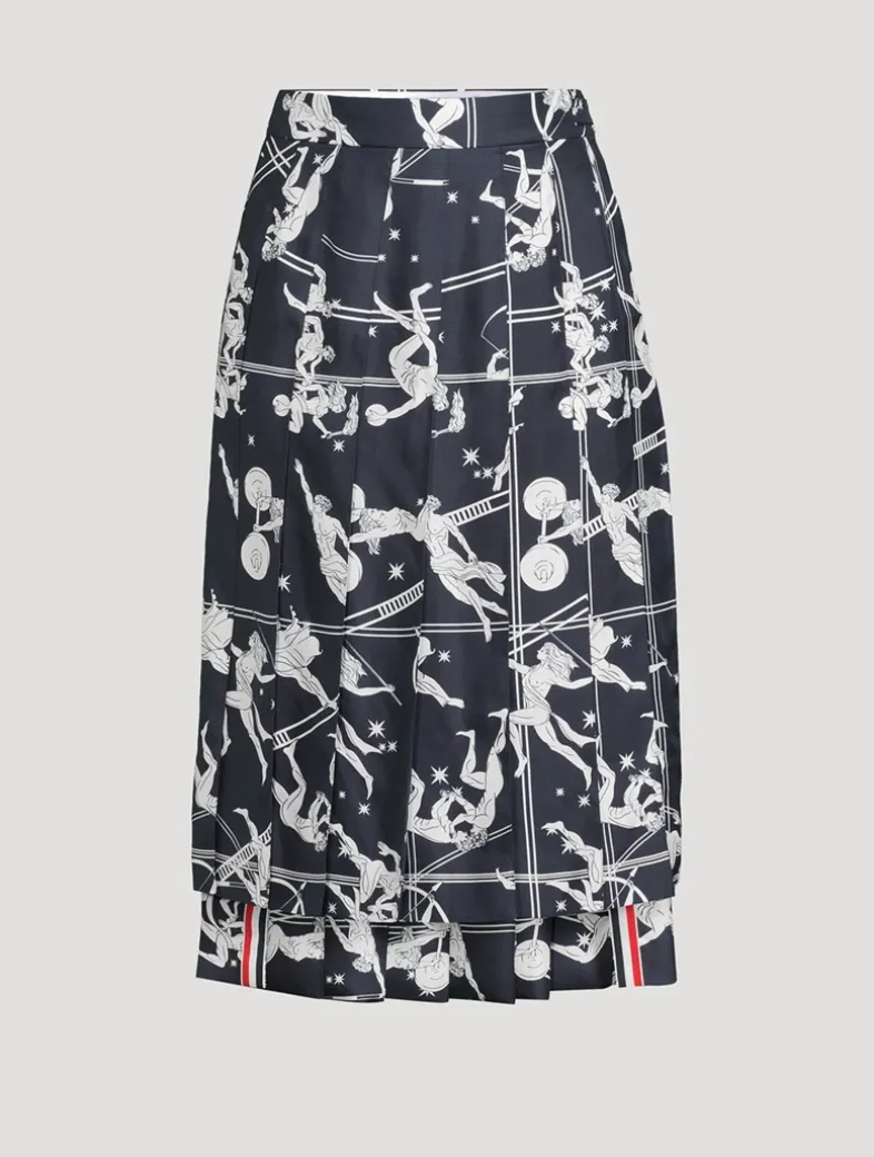 A pleated midi skirt receives an Olympic-level upgrade, featuring ancient Grecian athletes competing across the silk fabric. Topped with a flat waistband, it has a high-low hem edged with signature striped grosgrain trim.