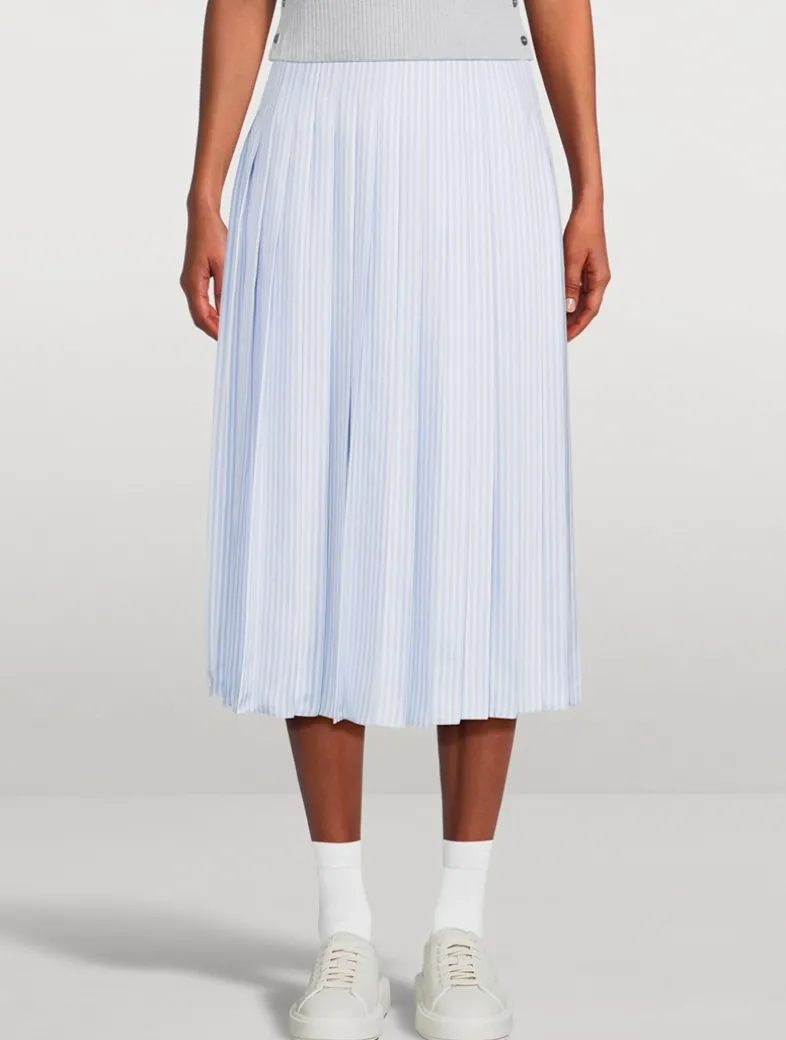 This enchanting skirt marries the enduring elegance of classic suiting with a playful, spirited bow decorated in signature Thom Browne stripes. Crafted from silk twill, it has a pleated design and a mid-calf length.