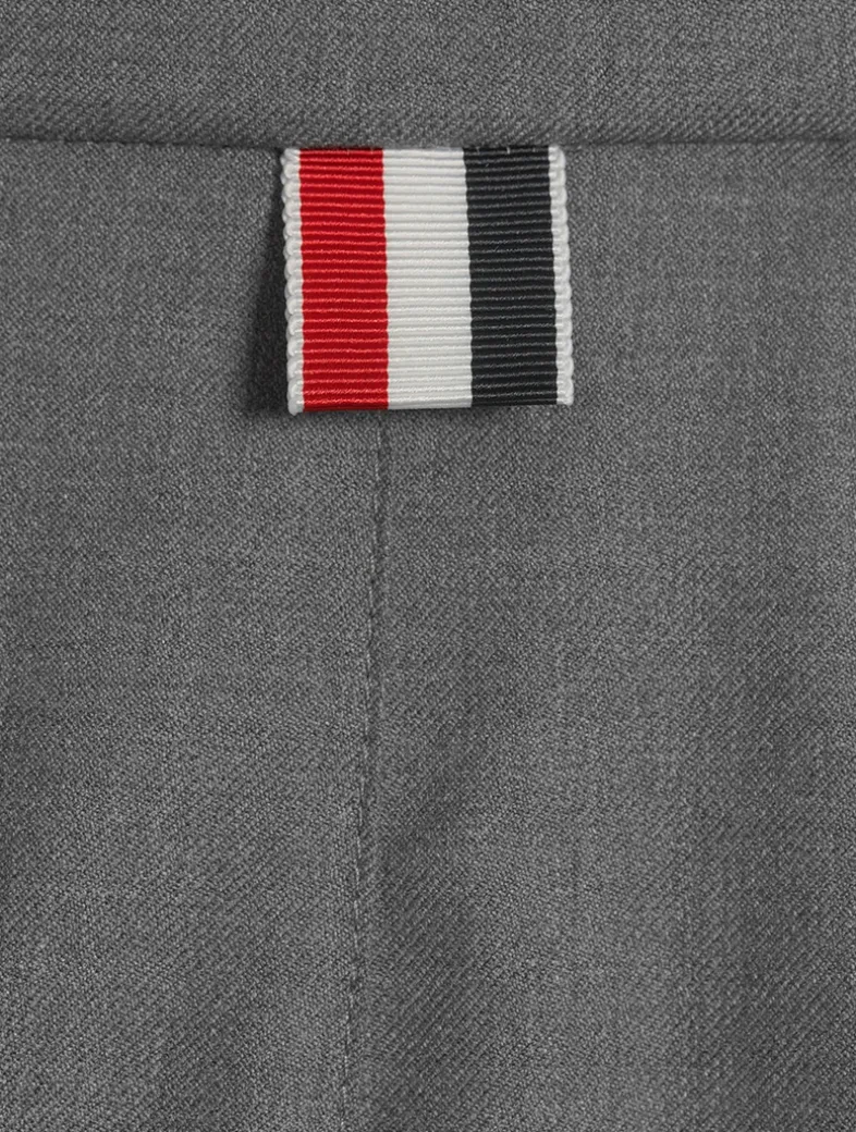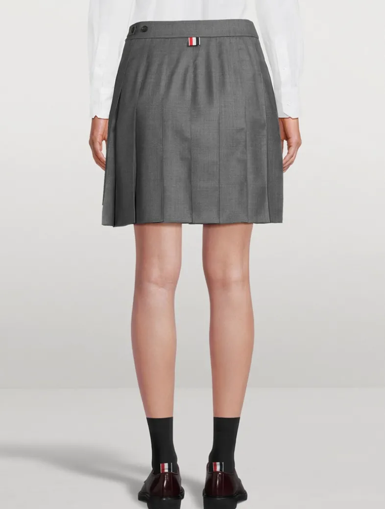 Made in Italy, this short skirt is designed with a dropped-back hem and signature grosgrain stripe detailing. Crafted in super 120s wool twill, the pleated mini is finished with a side zip closure and grosgrain loop tab at the back waist.