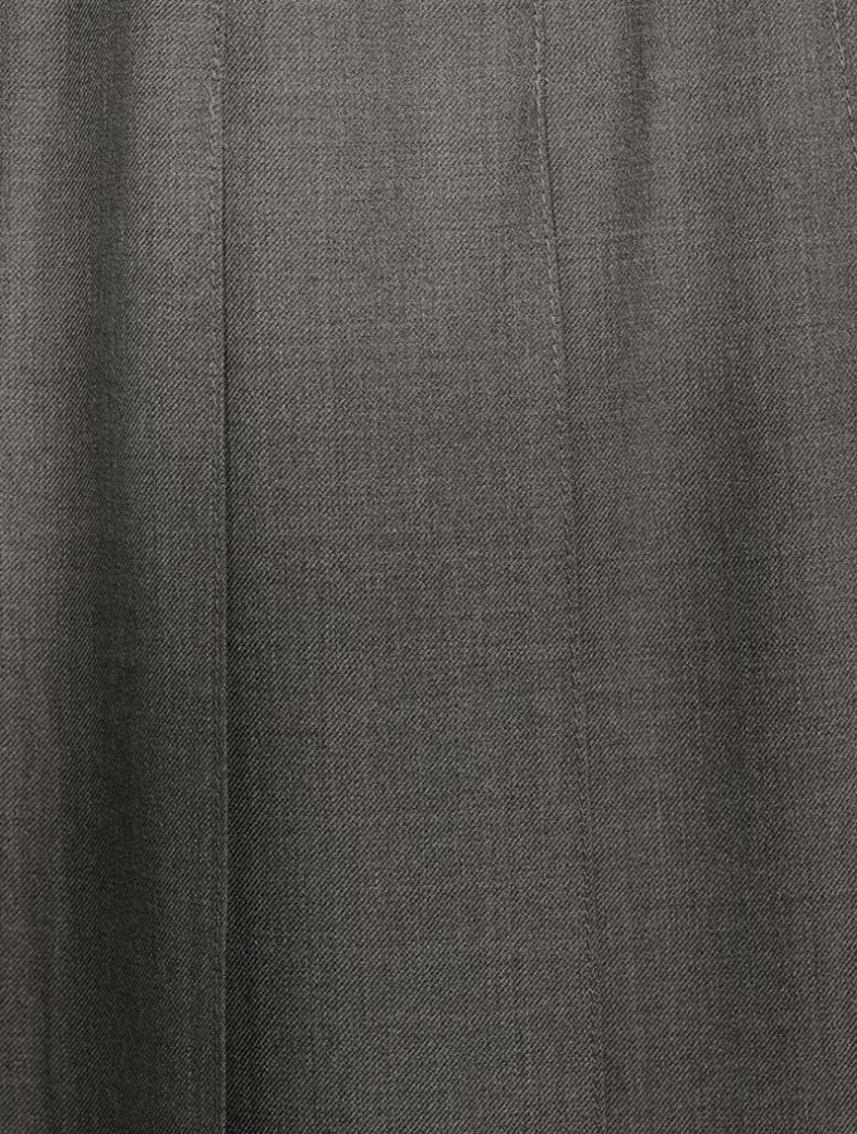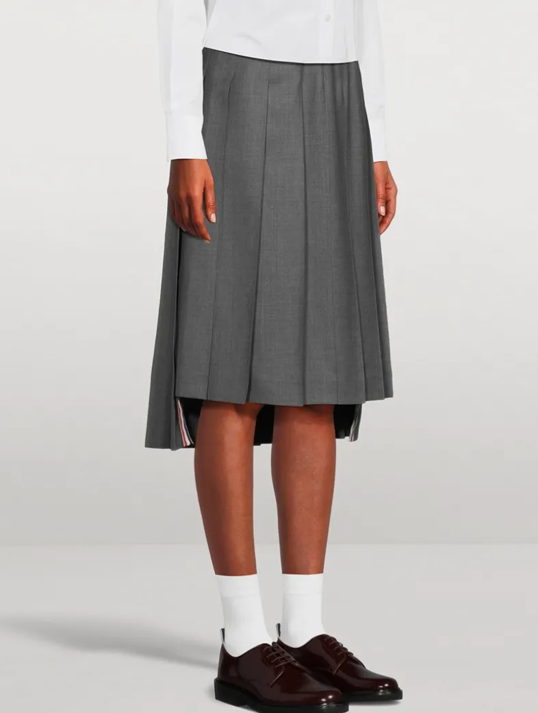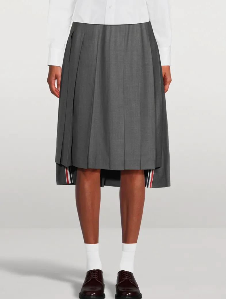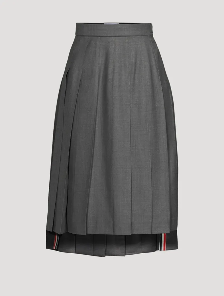 Inspired by East Coast preppy icons but reimagined with inventive proportions and quality craftsmanship, this pleated skirt is a fresh take on a traditional silhouette. It has a dropped-back hem with signature striped grosgrain trim and adjustable buttoned side tab closure.