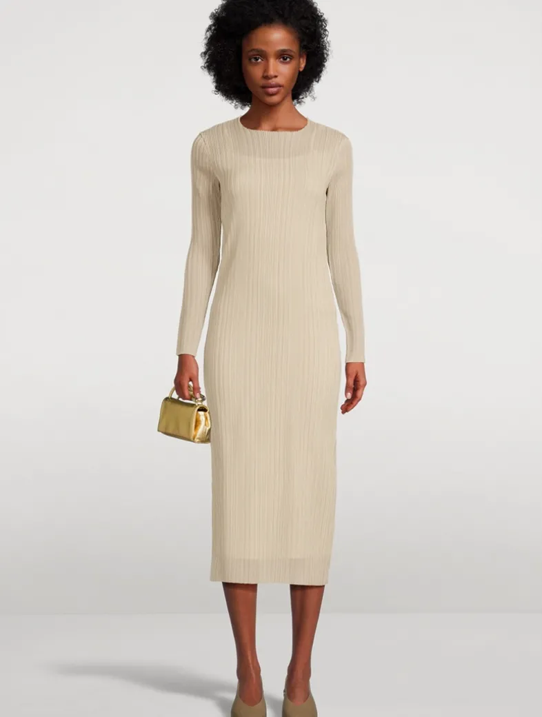 This slim, column-like dress is constructed with sheer two-tone crinkled pleating throughout, lending it texture and dimension that beckon a closer look.