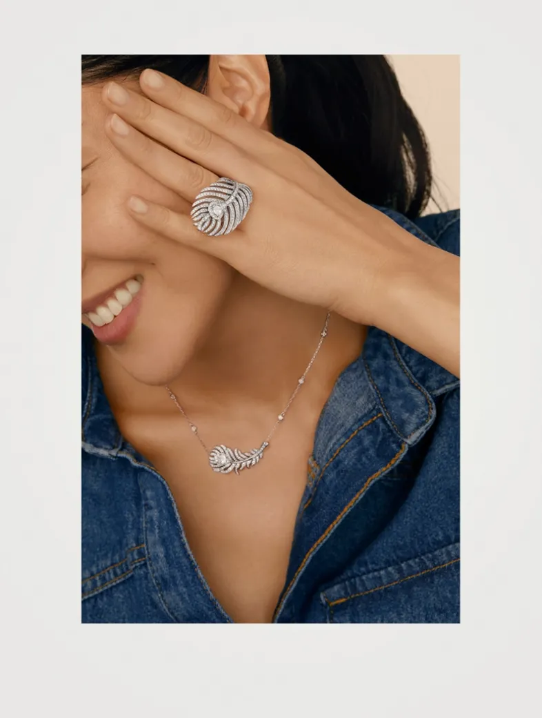 From the Nature Triomphante collection. Born from Frédéric Boucheron’s original inspiration 130 years ago, feathers have become a part of the Maison’s history and heritage. Created using a new technique that emulates the look of a real peacock feather, the pendant features one rose-cut diamond and round diamonds that sparkle and sway with every movement. The classic chain is updated with bezel-set diamonds.