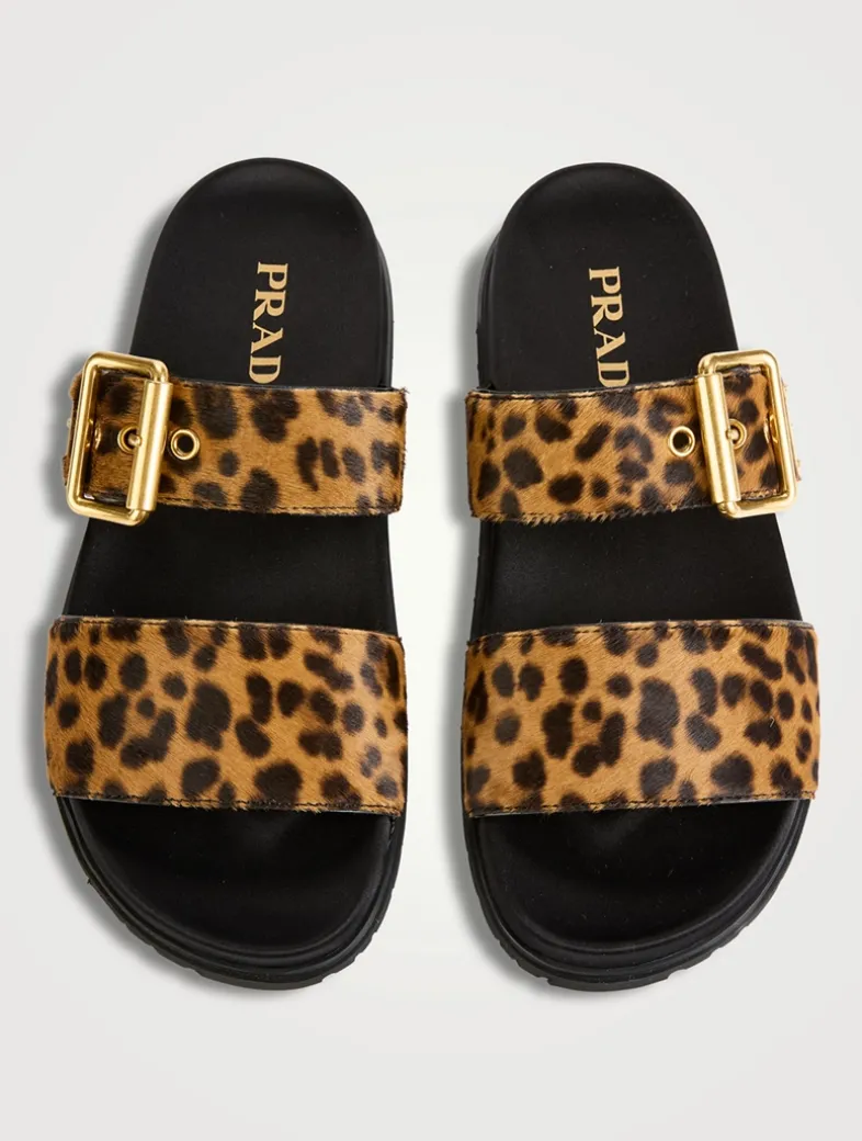 These sandals feature a hybrid silhouette that combines sporty details with the refined touch of leather brightened by a leopard print. The footwear defined by metal buckles is completed by comfortable rubber soles and the signature touch of the enamelled metal triangle logo.