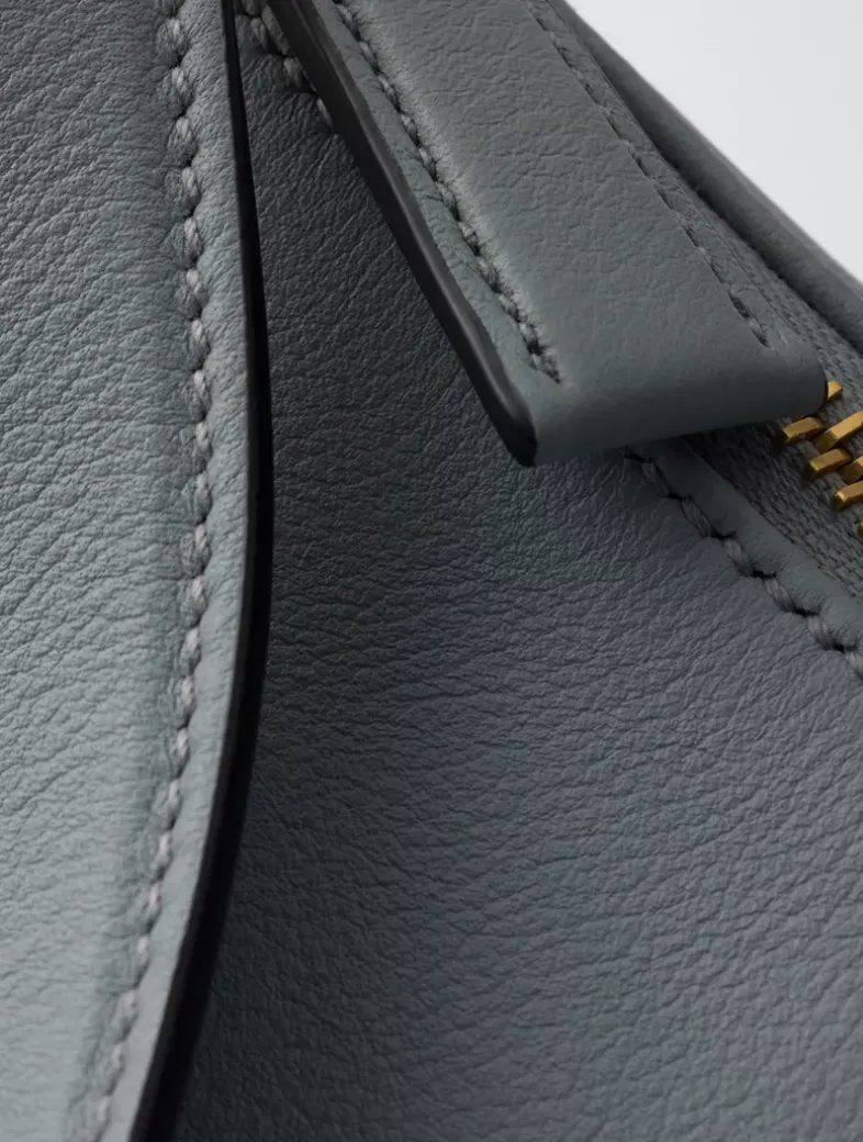 Leather handle Removable key holder Metal hardware Enamelled metal triangle logo on the front Zipper closure Nappa leather interior with two pockets, including one with zipper closure