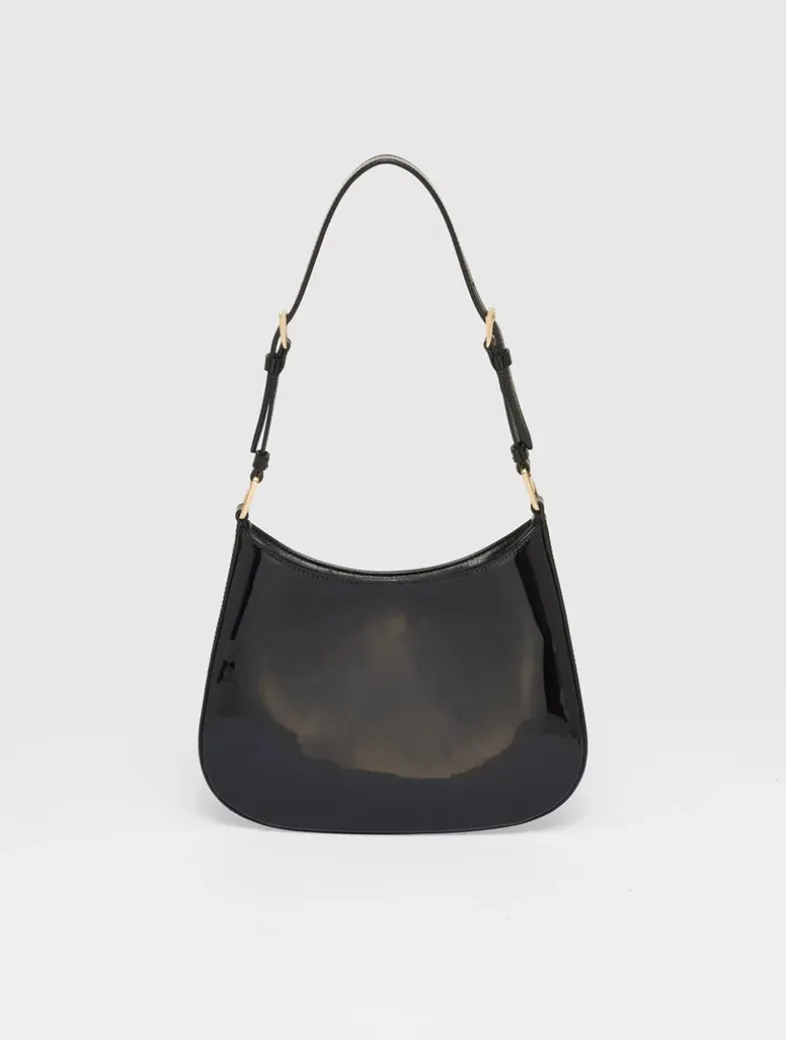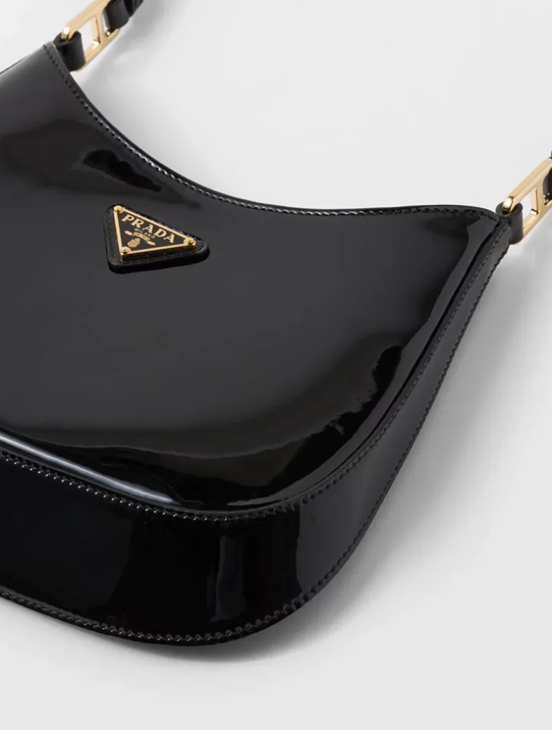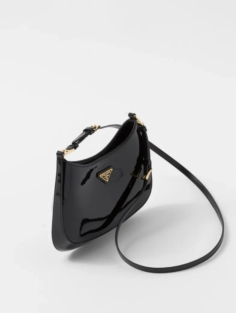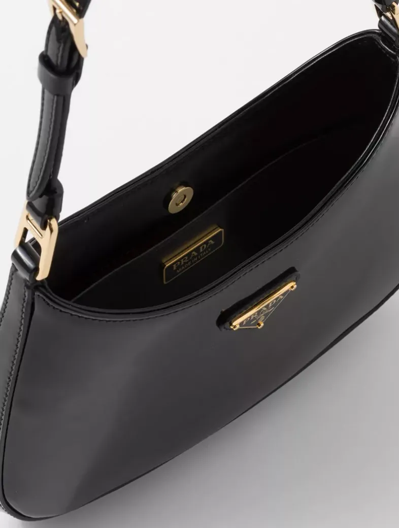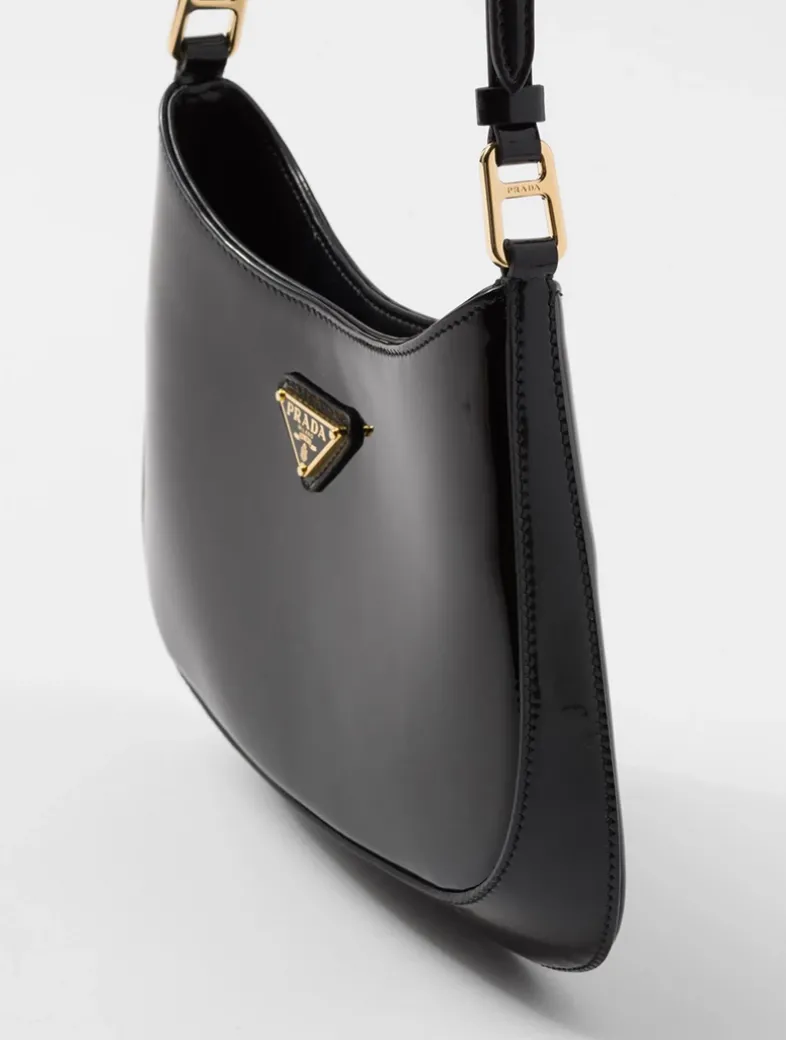 Handle with leather extension for cross-body use Metal hardware Enameled metal triangle logo on the front Magnetic closure Nappa leather interior with patch pocket