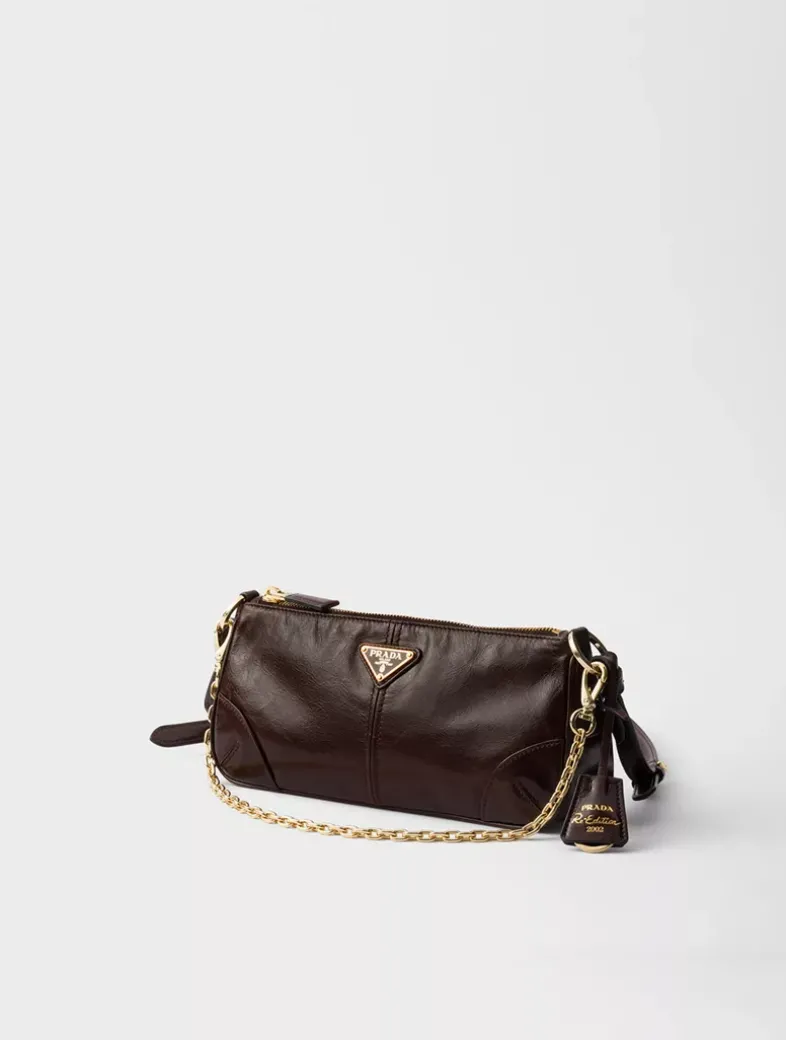 Brushed leather details Removable chain handle Shoulder strap Detachable, adjustable leather handle, length: 70 cm Maximum length 75 cm – Minimum length 65 cm – Maximum drop 35 cm- Minimum drop 30 cm Removable leather key chain Metal hardware Enameled metal triangle logo on the front Zipper closure Logo-print nylon lining