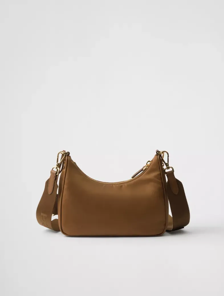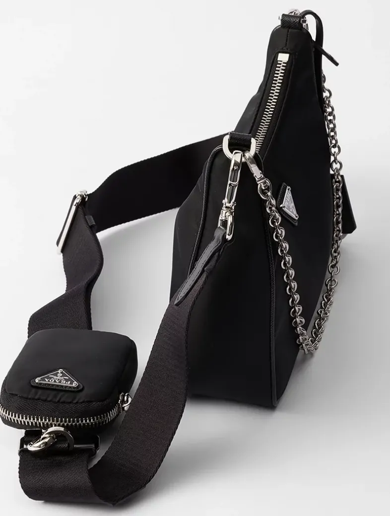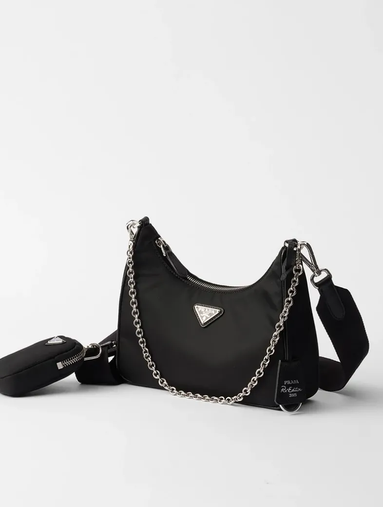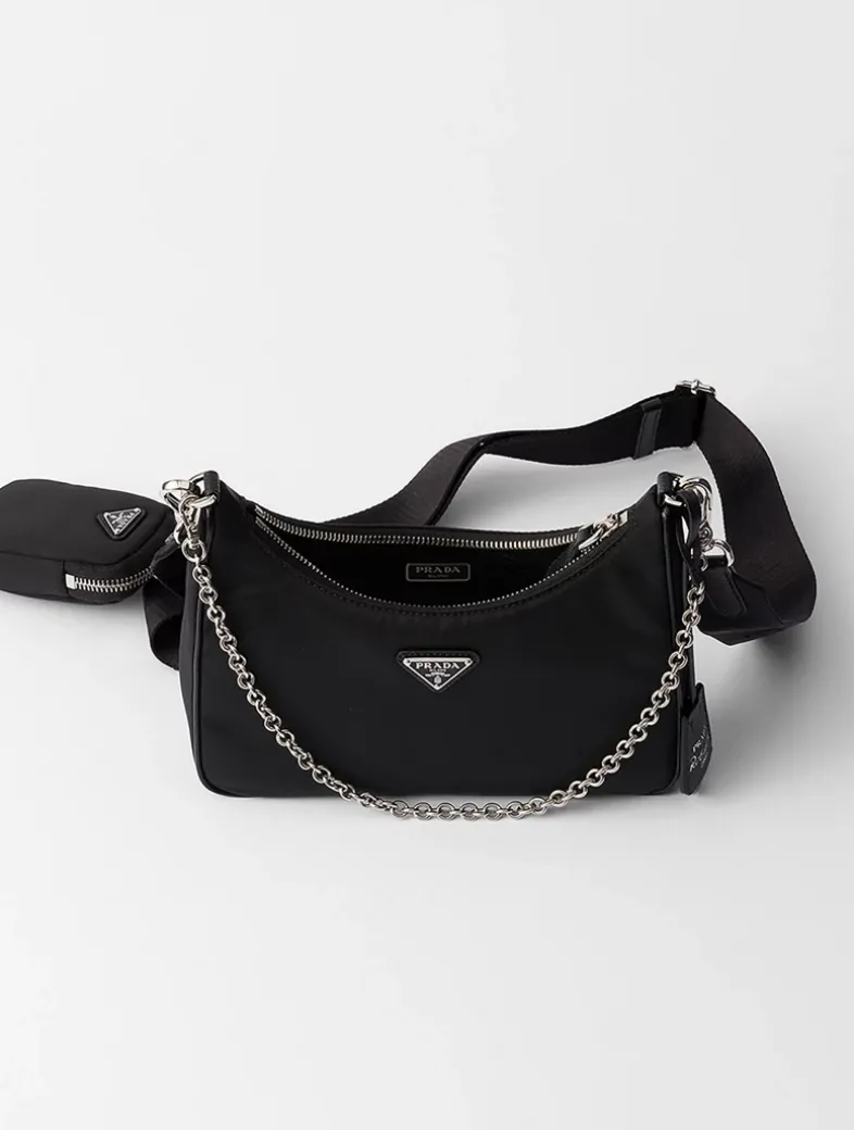 Saffiano trim Removable chain handle Detachable adjustable 85 cm logo-print woven nylon shoulder strap Removable Re-Nylon zipper pouch with Re-Edition keychain Metal hardware Enameled metal triangle logo on the front Zipper closure Re-Nylon logo lining