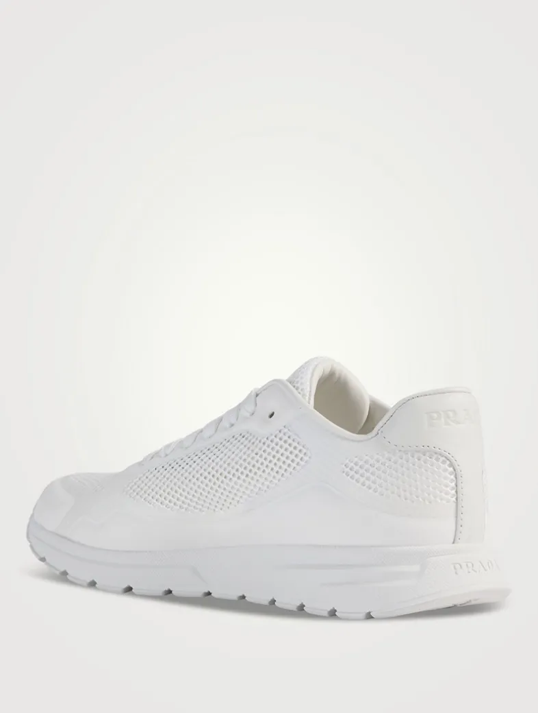 Prax sneakers combine a contemporary design with details that are emblematic of Prada collections. The enamelled metal triangle logo embellishes these sporty leather and mesh shoes completed by chunky rubber soles.