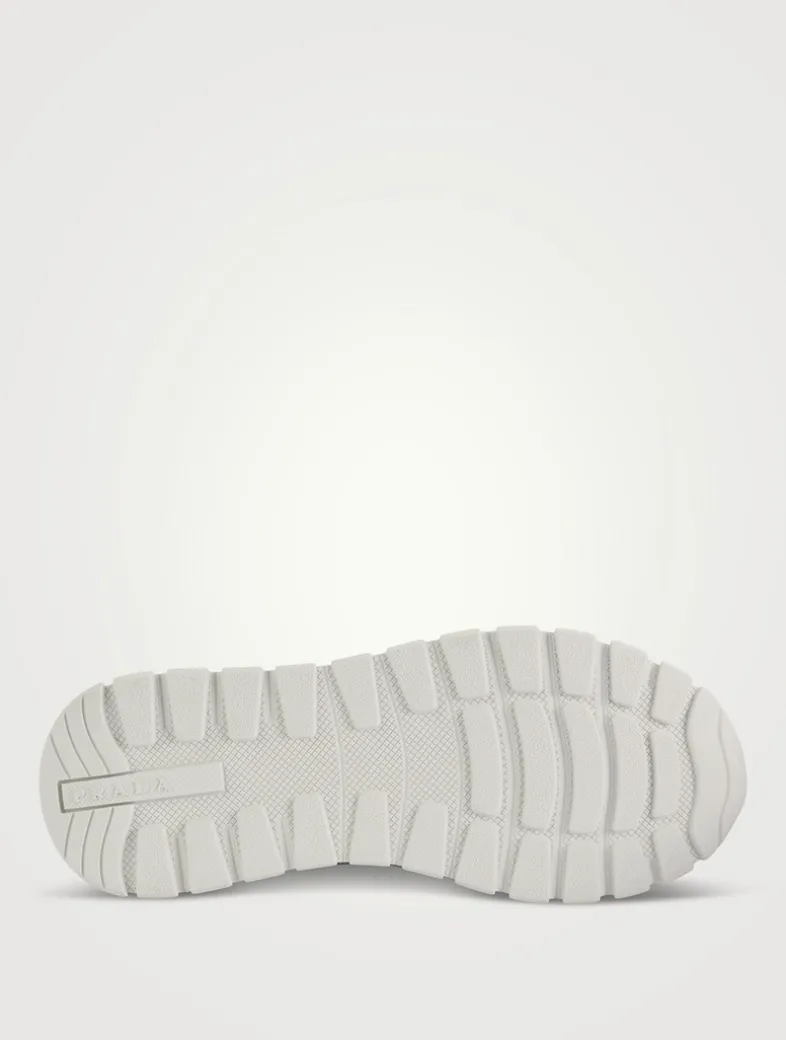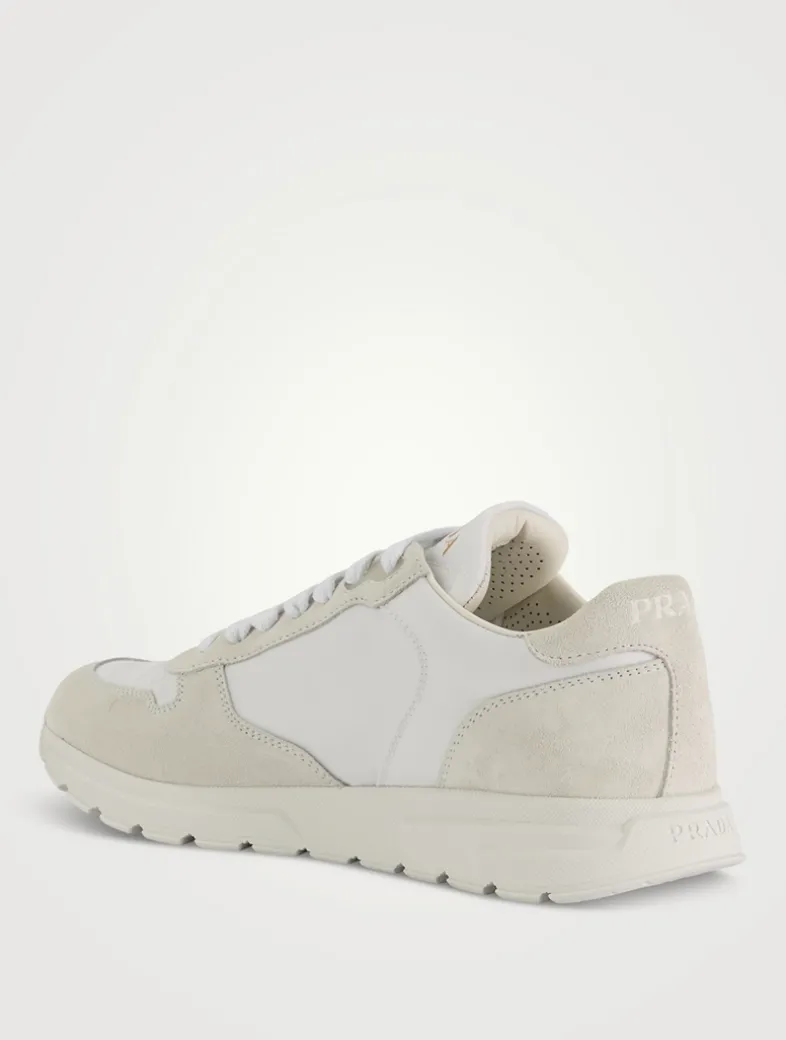 Prax sneakers combine a contemporary design with details that are emblematic of Prada collections. The enamelled metal triangle logo embellishes these sporty suede and recycled nylon shoes completed by chunky rubber soles.