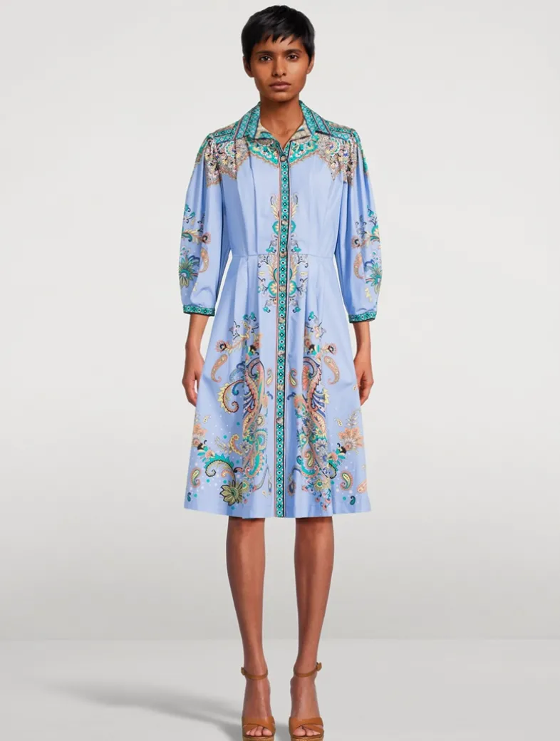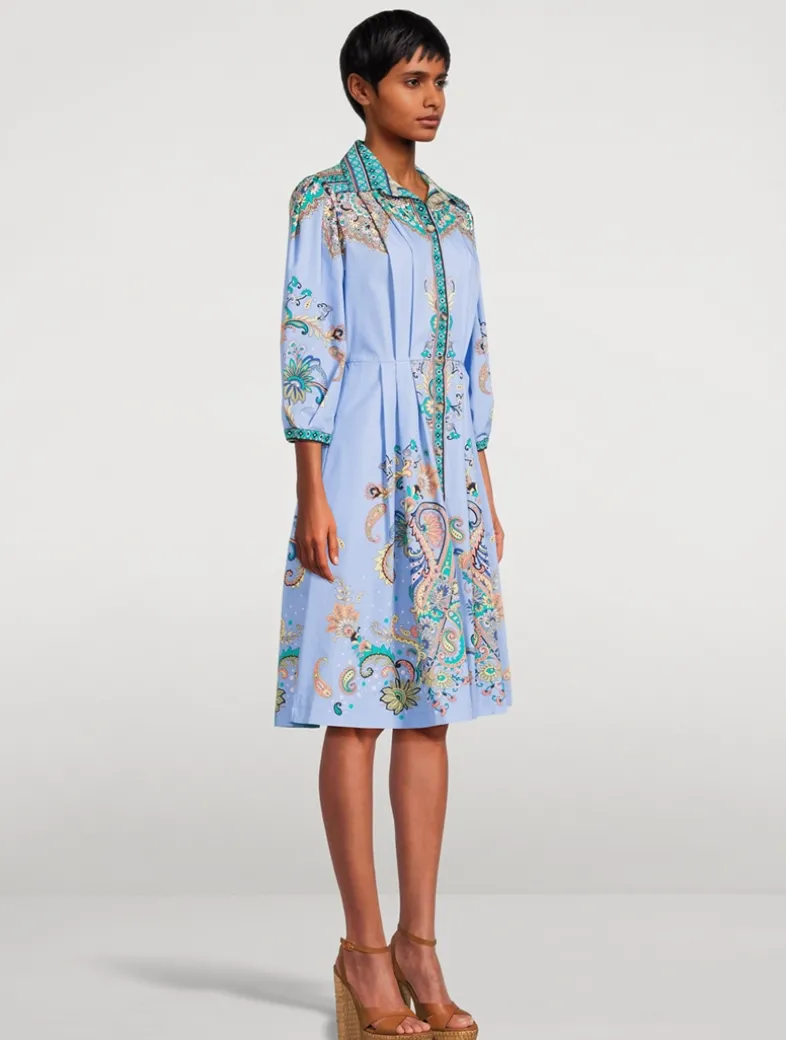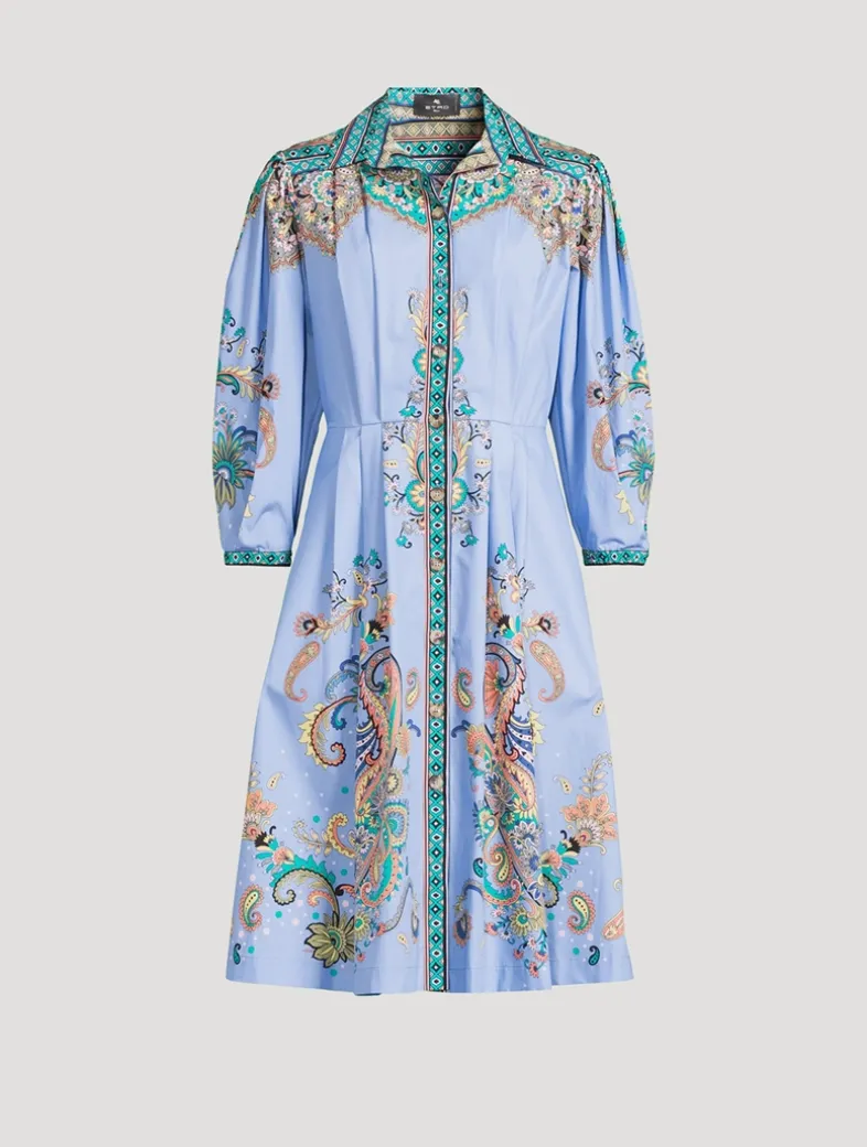 This shirt dress is crafted from a crisp cotton poplin printed with a vibrant paisley motif. It has three-quarter puffed sleeves and a nipped-in waist with pleating throughout that falls to a flared mid-length skirt.