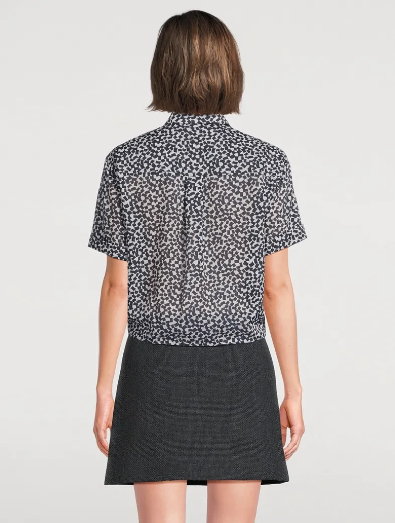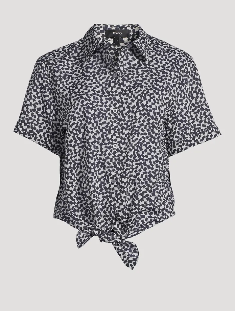 This classic short-sleeve shirt features a tie-front detail, buttoned closure, and pointed collar.