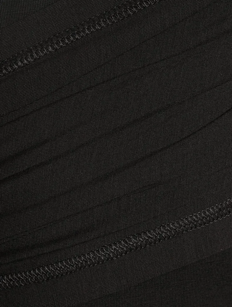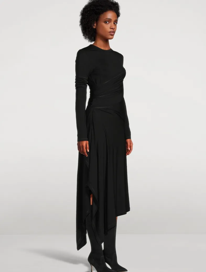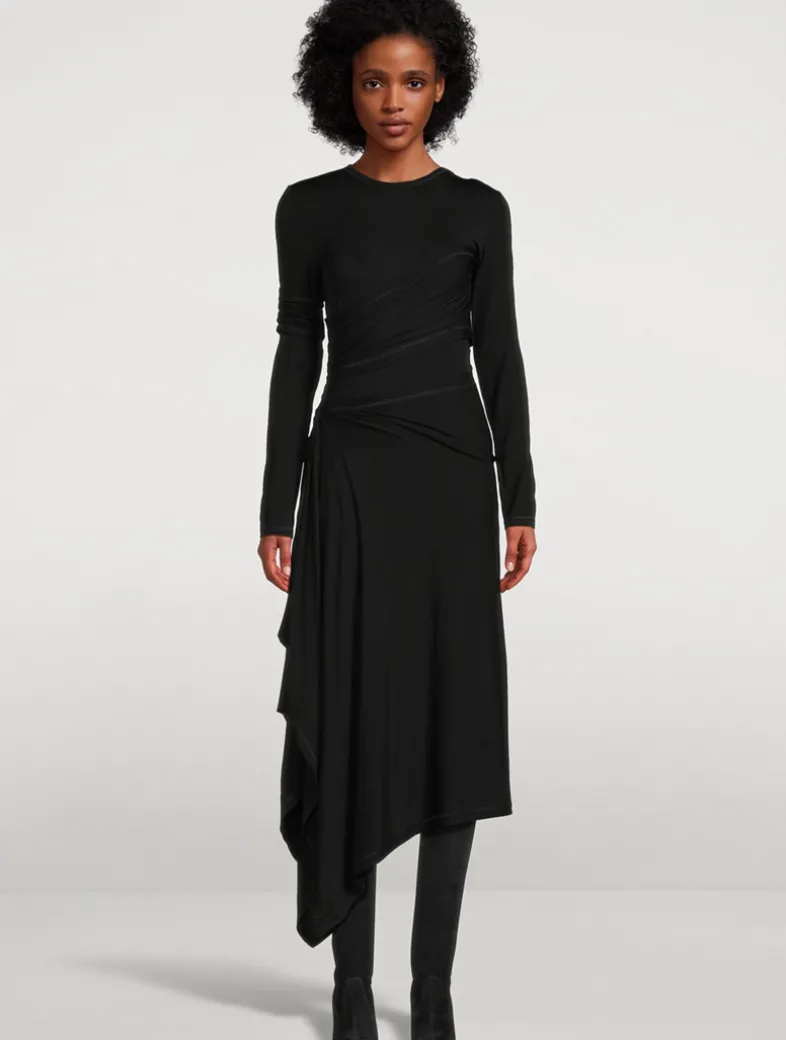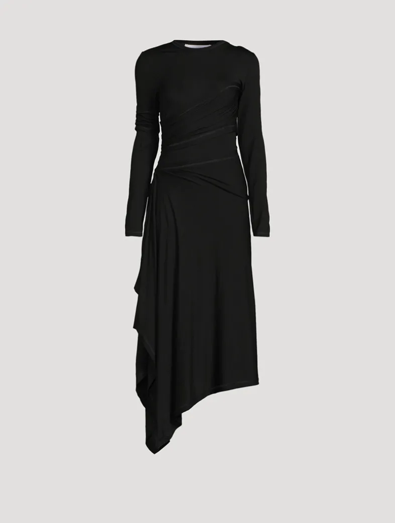 Long-sleeved dress in lyocell jersey. It features a layered design with draped panels that wrap around the body, creating a sense of movement and allowing for flashes of exposed skin.