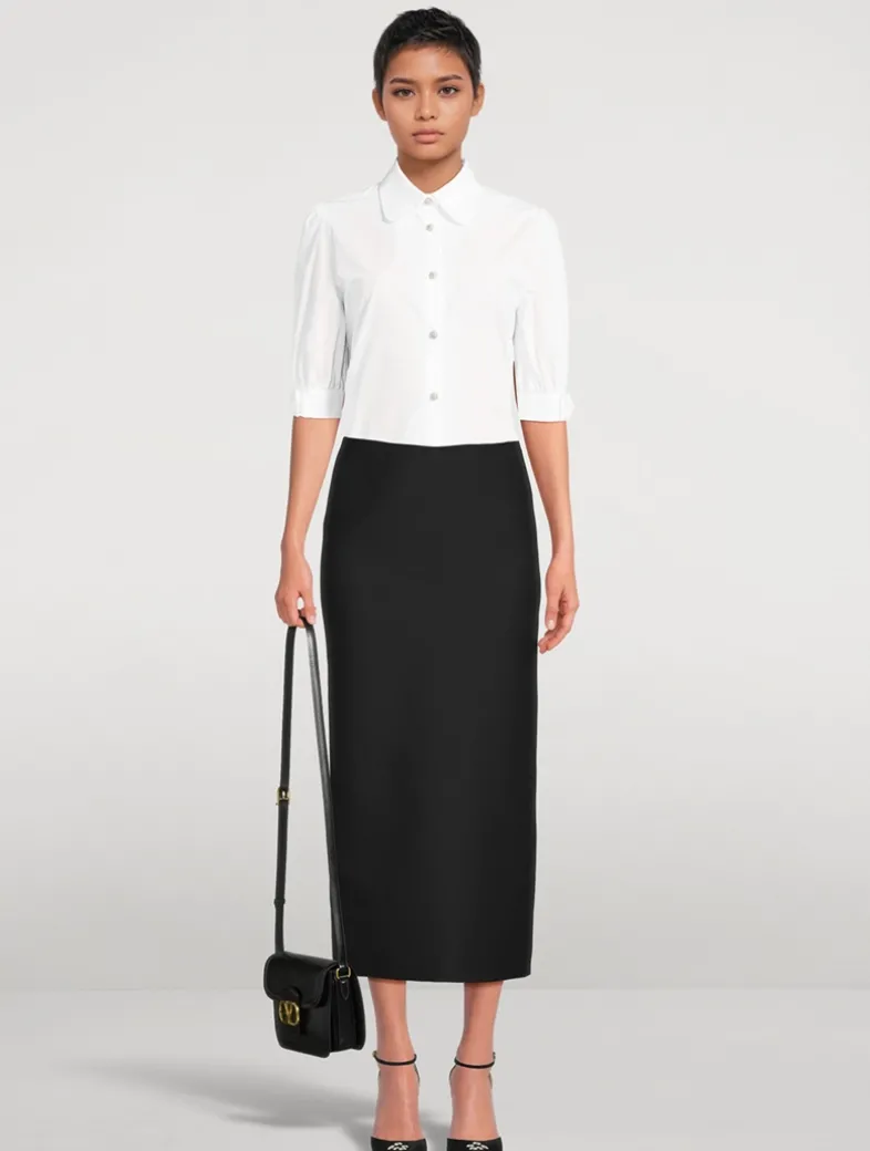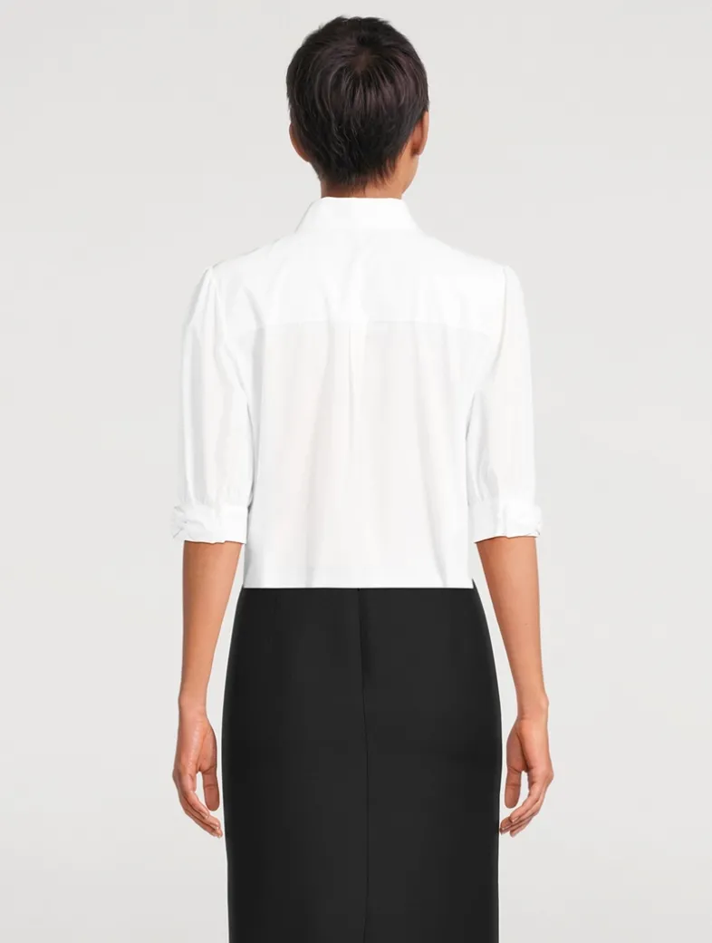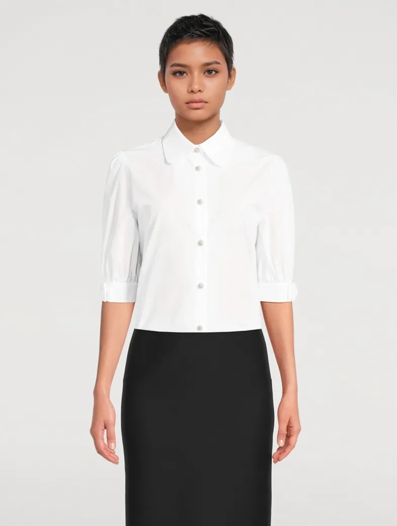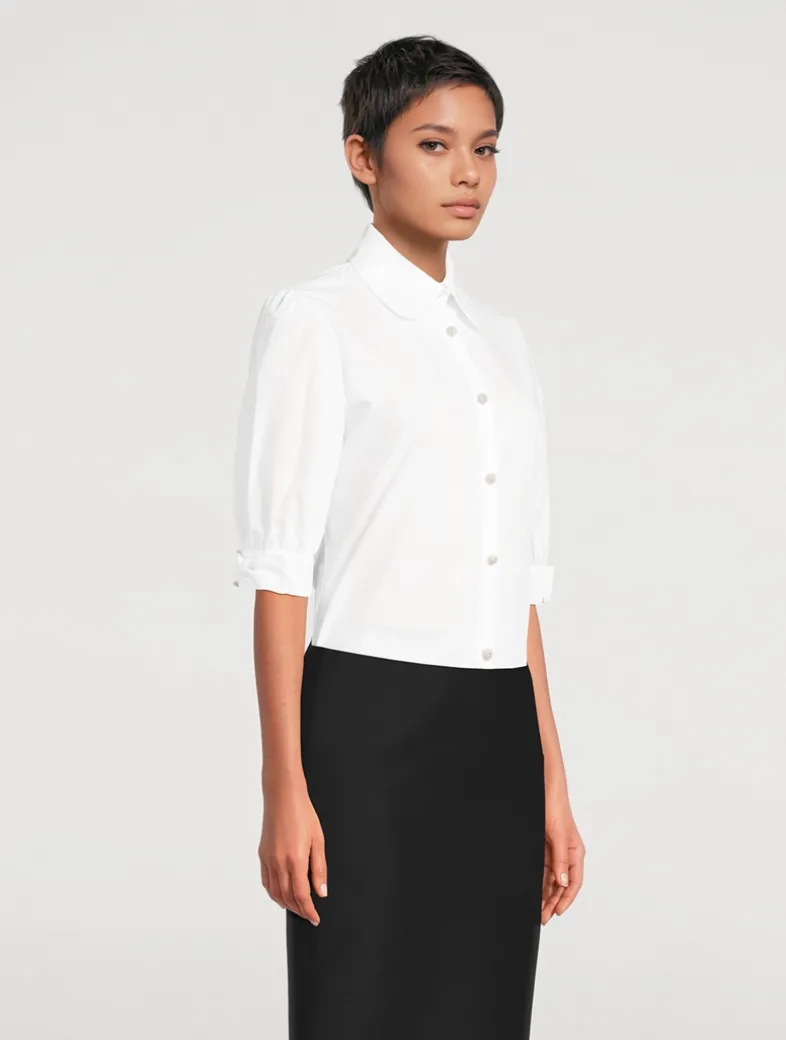 Dotted with delicate crystals on its buttons, this crisp cotton top is an elevated essential. It has a rounded shirt collar and short puff sleeves with bow-adorned cuffs.