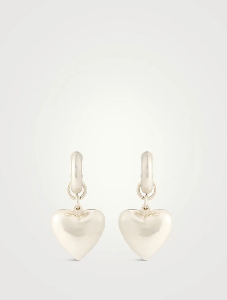 Enhanced with a silver-tone finish, these huggie hoop earrings are adorned with dangling puffy hearts.