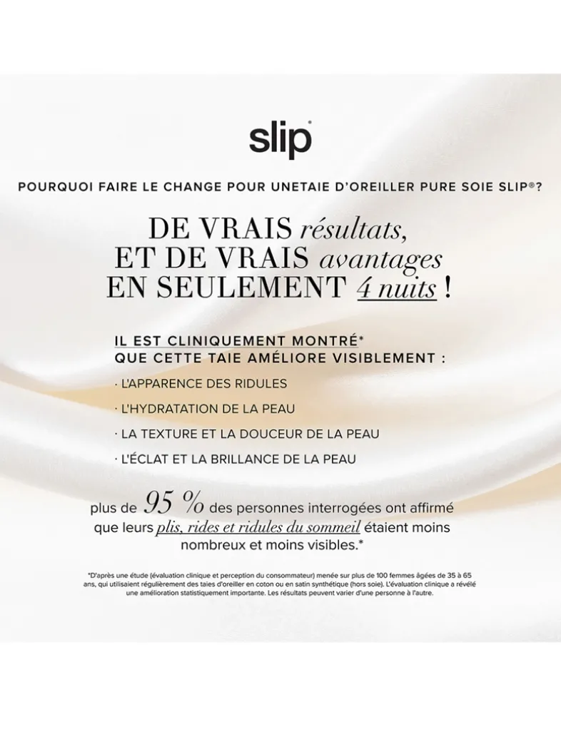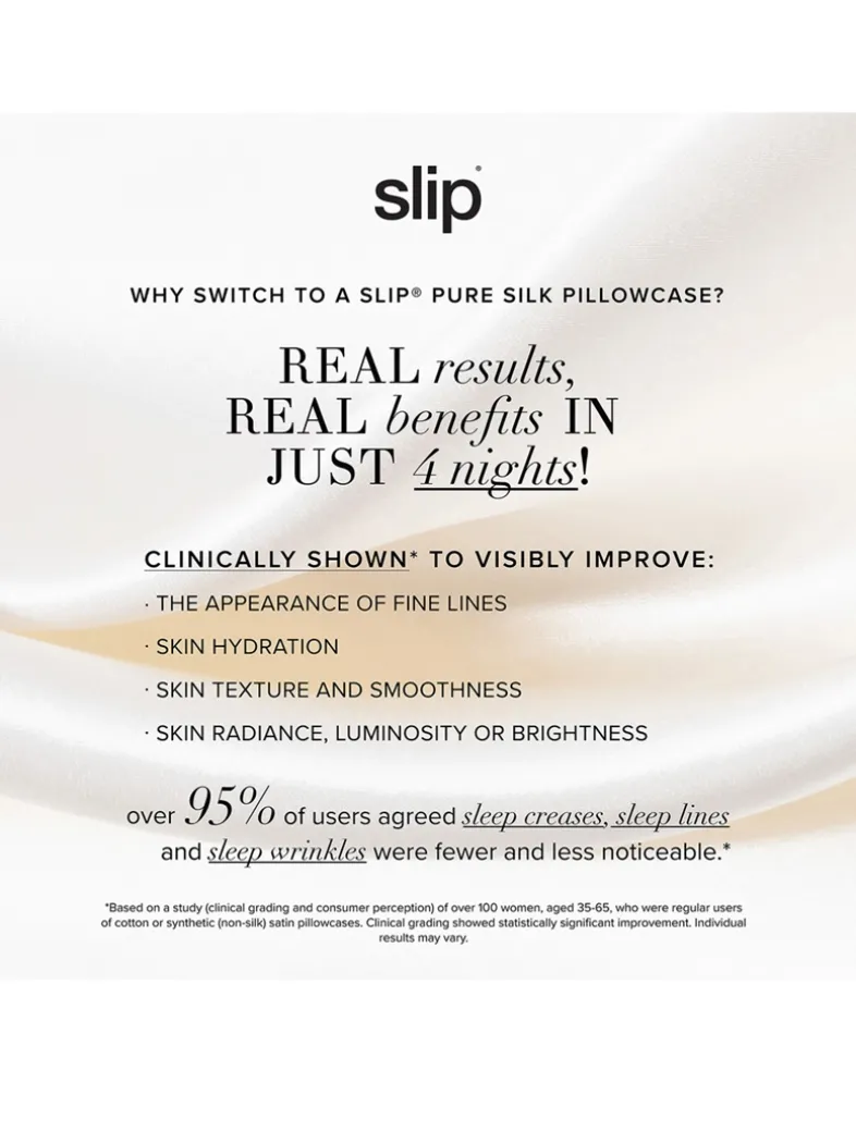 Why switch to a Slip pure silk pillowcase? Clinically shown to visibly improve: the appearance of fine lines, skin hydration, skin texture and smoothness, and skin radiance, luminosity or brightness. Over 95% of users agreed sleep creases, sleep lines and sleep wrinkles were fewer and less noticeable. The beauty secret of celebrity hairstylists, dermatologists and beauty experts.