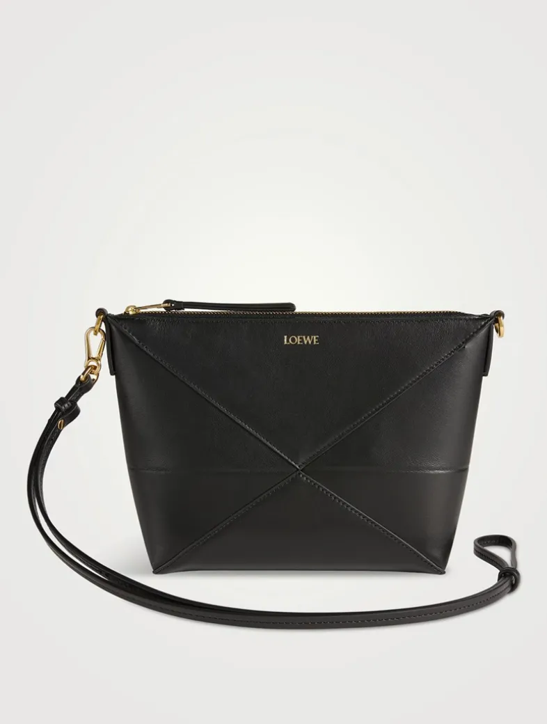 Crafted in shiny calfskin with a herringbone cotton canvas lining, this wash bag is inspired by the Puzzle Fold’s graphic and architectural foldable panels. A removable strap allows it to be carried as a wristlet or clutch.