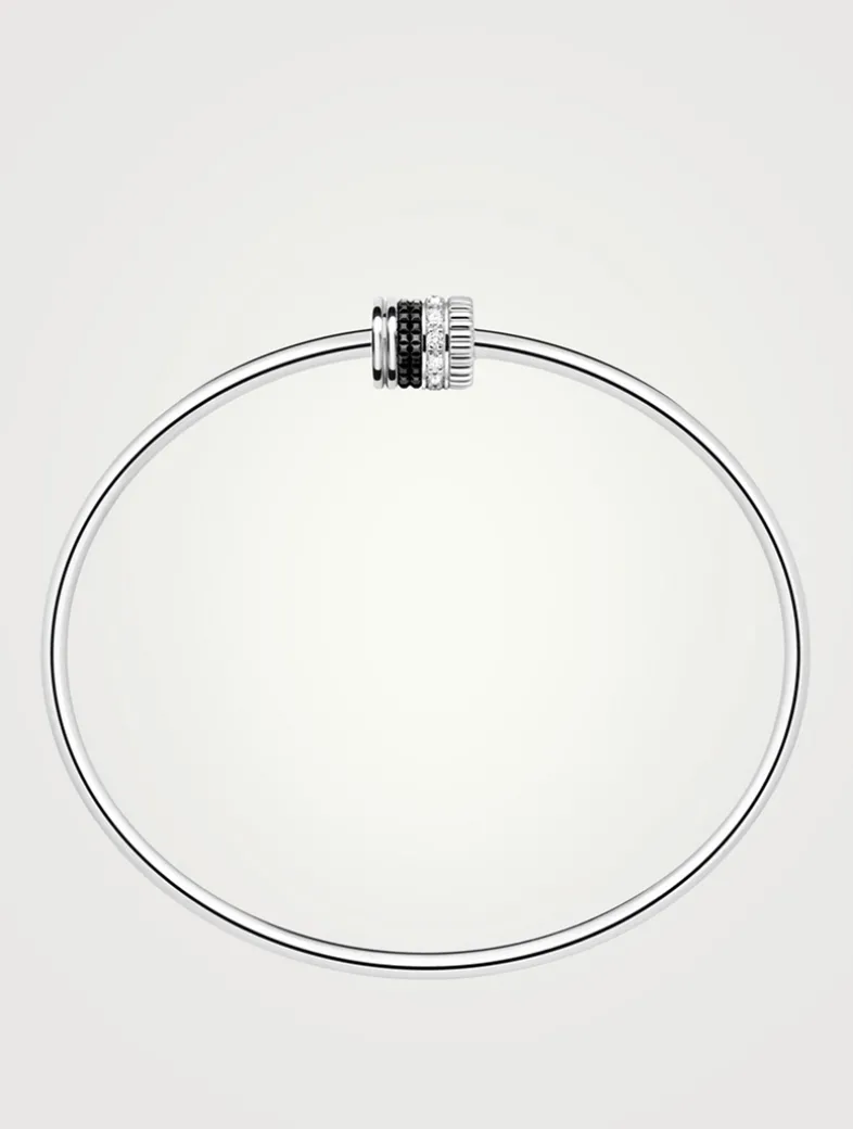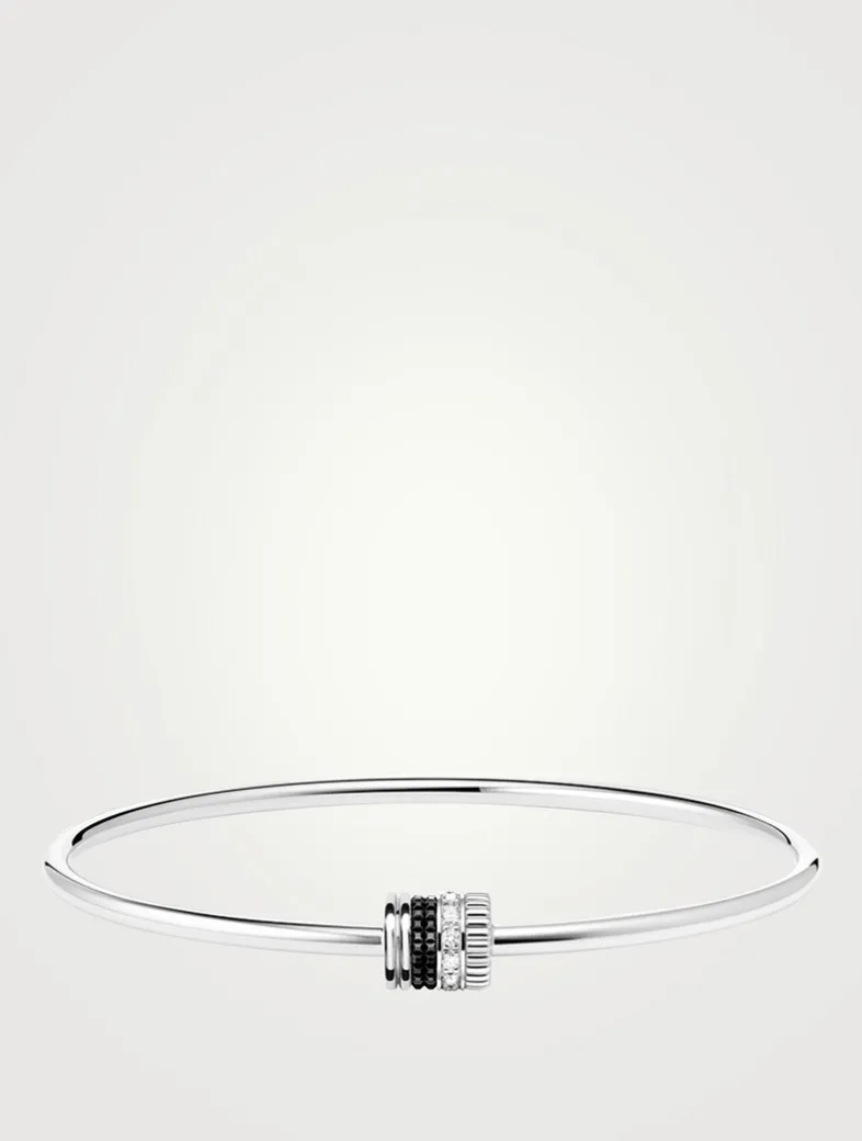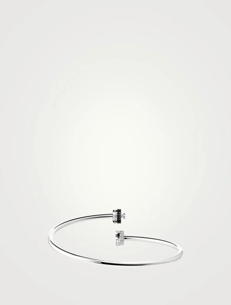 This polished bangle of white gold is set with a hidden clasp in the central motif. Split in two upon opening, the Quatre clasp showcases the intense black of the PVD, the brilliance of the diamonds.