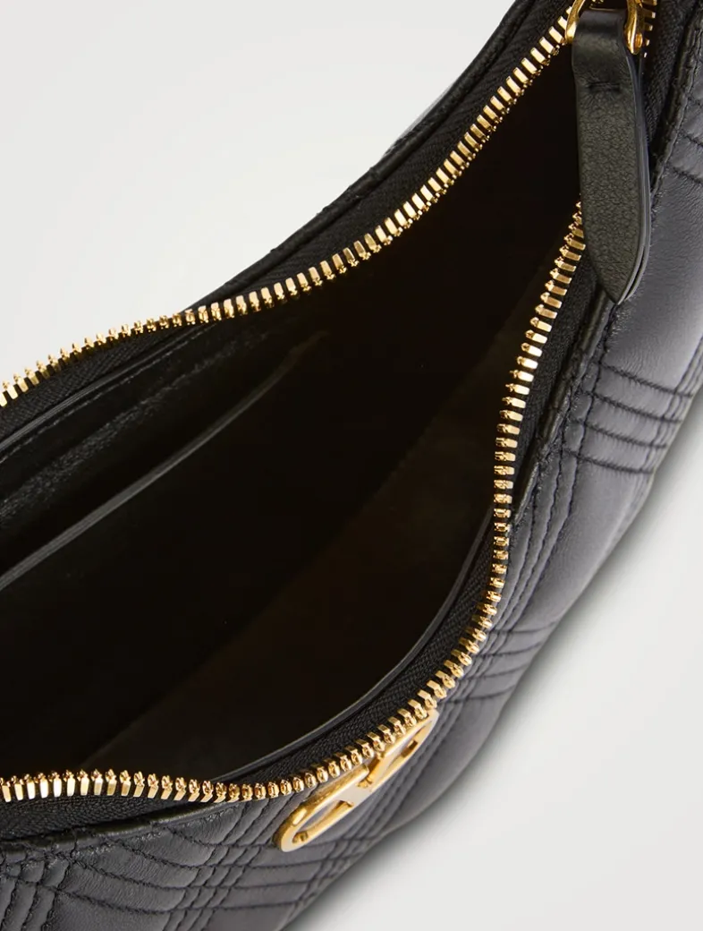 This leather shoulder bag is defined by a quilted construction with diamond pattern outlined by tone-on-tone stitching.