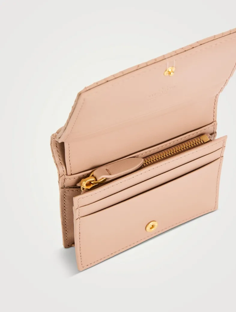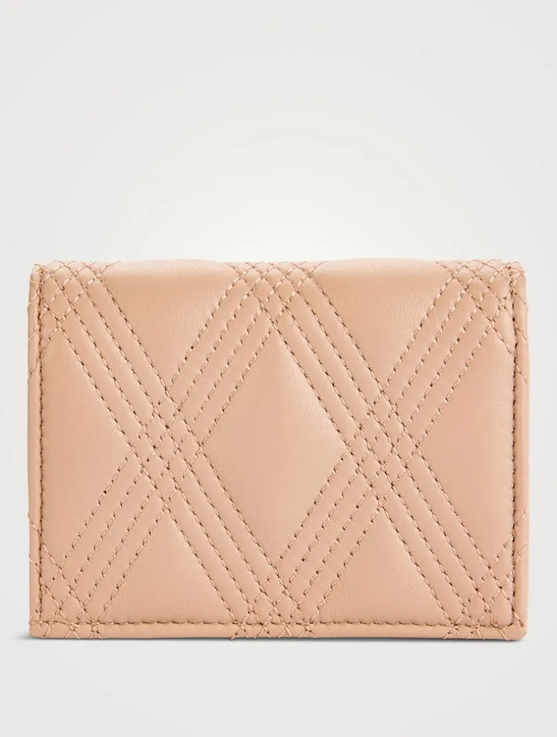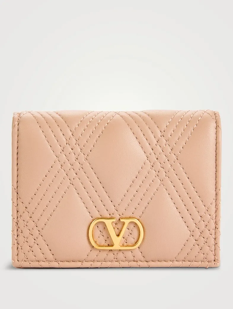 This leather wallet is defined by a quilted construction with diamond pattern outlined by tone-on-tone stitching. It has five card slots, one slip pocket, a zippered coin pocket, and one bill pocket.