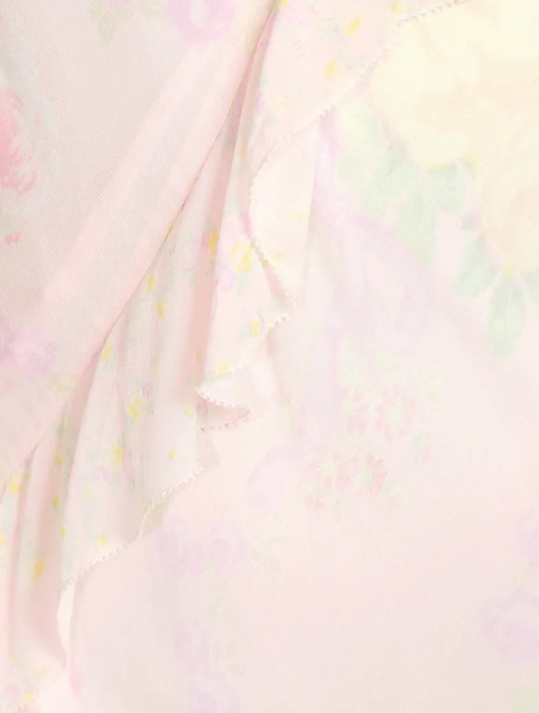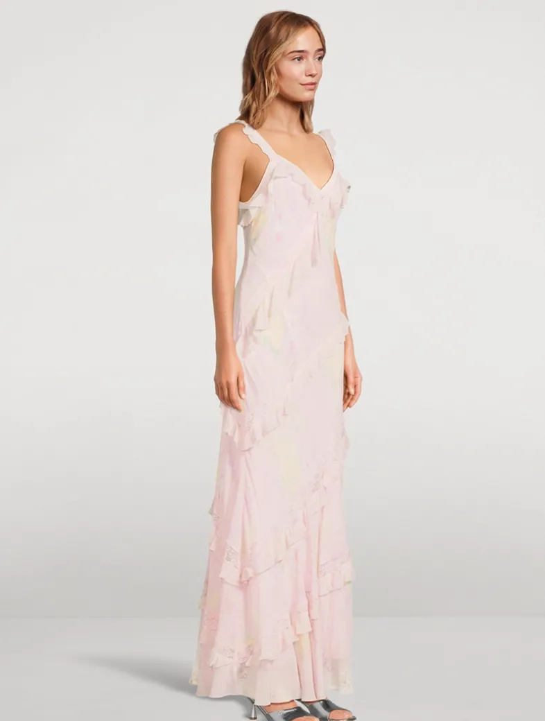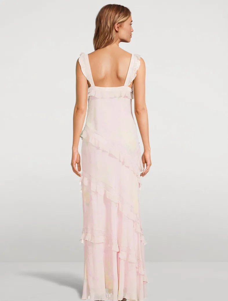 Crafted from a lightweight fabric, this floor-grazing maxi dress is printed with a faded floral motif and embellished with fluttering ruffles.