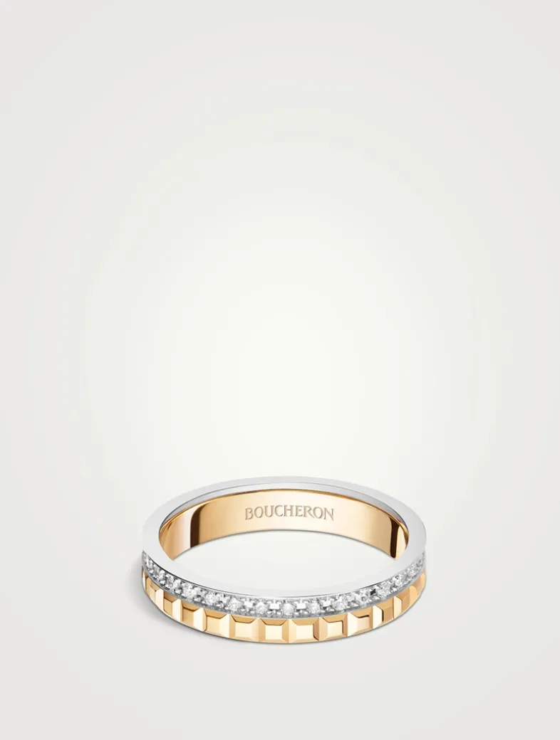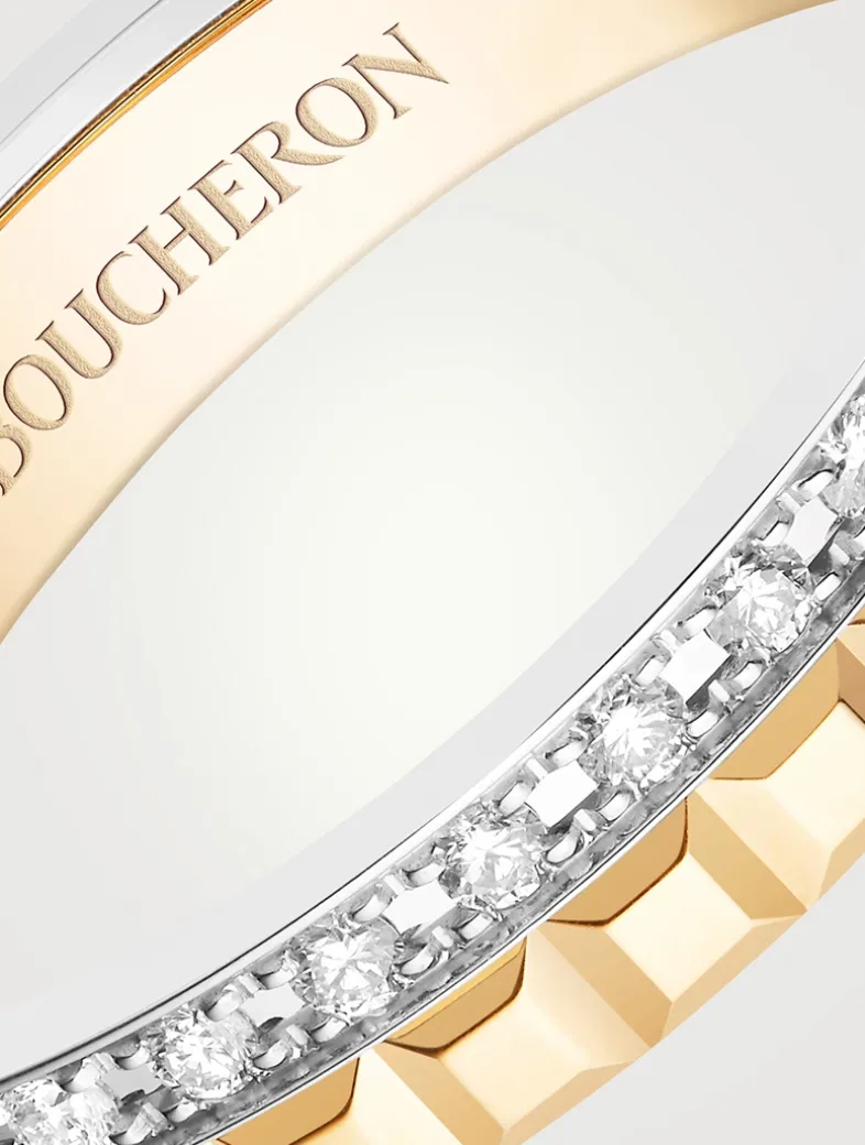 Crafted in yellow and white gold, this wedding band features the sculptural effect of the Clou de Paris motif and a sparkling row of 33 diamonds.
