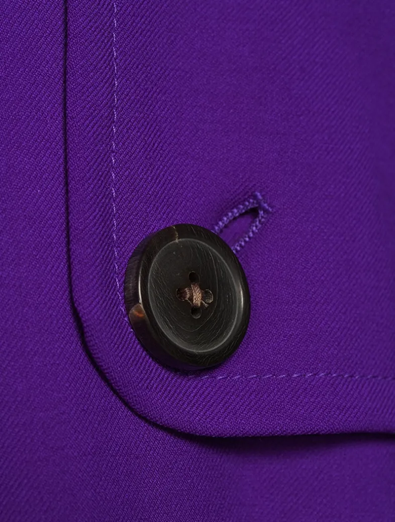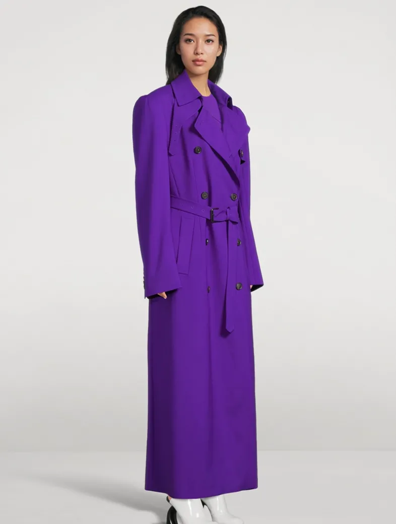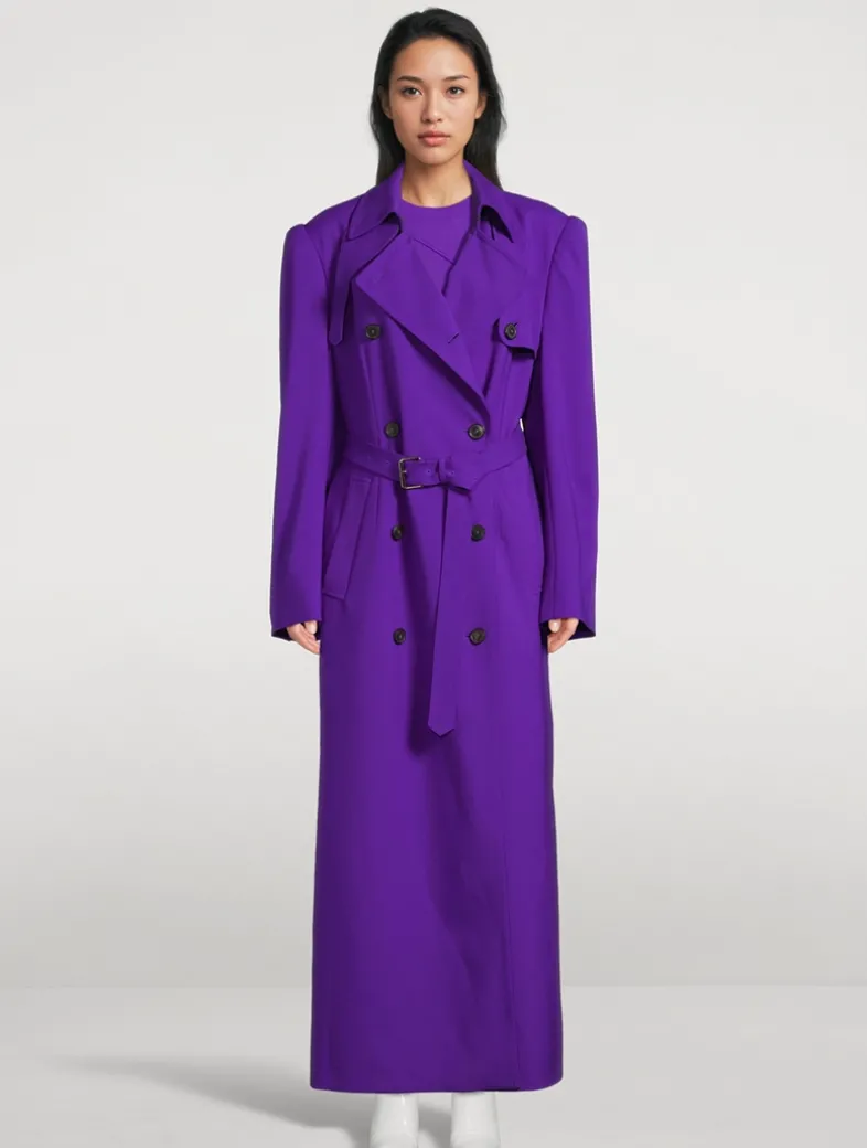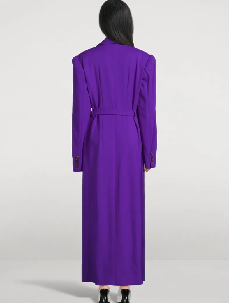 Crafted in stretch wool, this elegant topper is designed with puffed sleeves, side slit pockets, and a single vent at the rear. It has a double-breasted closure finished with a matching belt.
